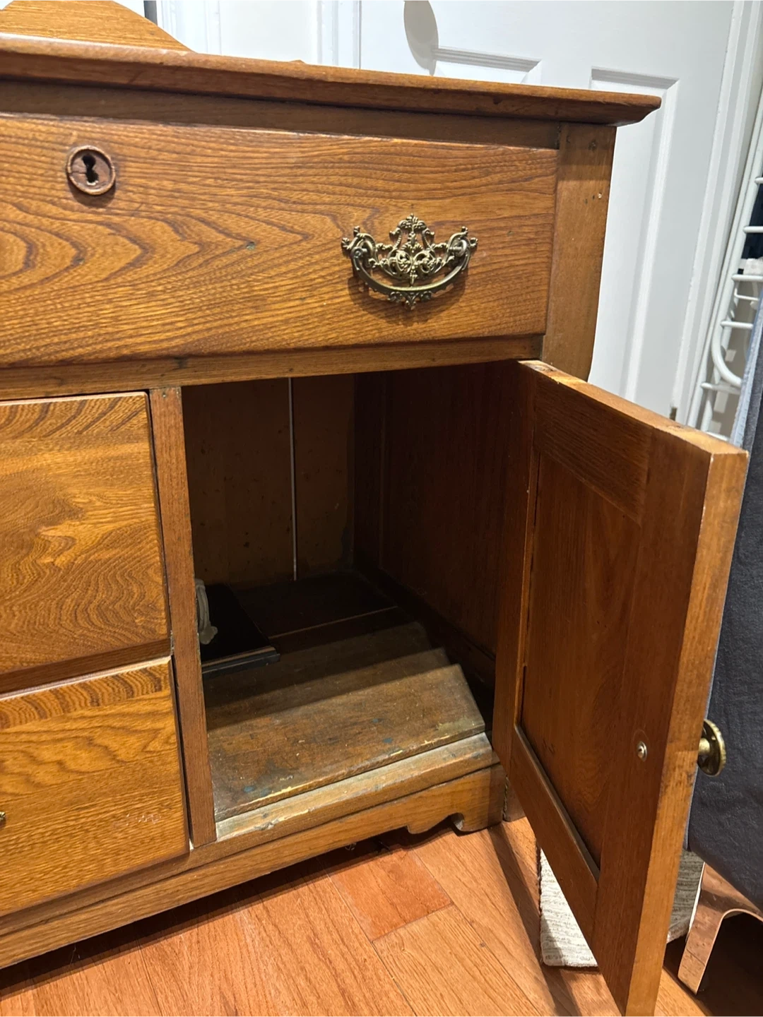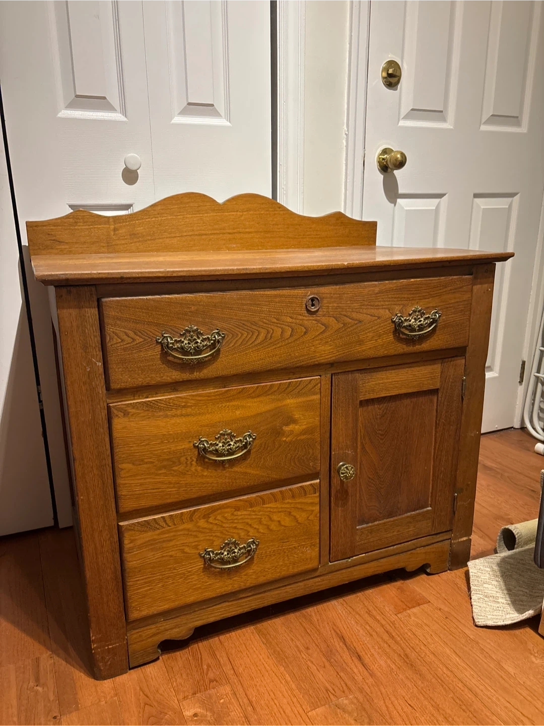 This antique dresser is made of solid oak with ornate brass hardware. It features 2 small drawers on the left, 1 long drawer on top and a cabinet with a door on the right. The wood has a warm, natural finish.