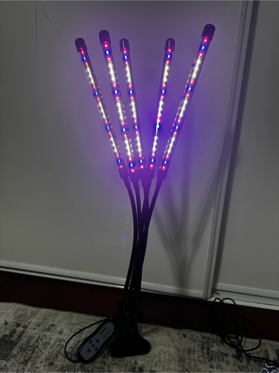 This LED plant grow light has five flexible goosenecks, each with adjustable brightness and spectrum. It includes a remote control with a timer function for 4, 8, or 12 hours. This light provides full spectrum illumination for seedlings and houseplants.