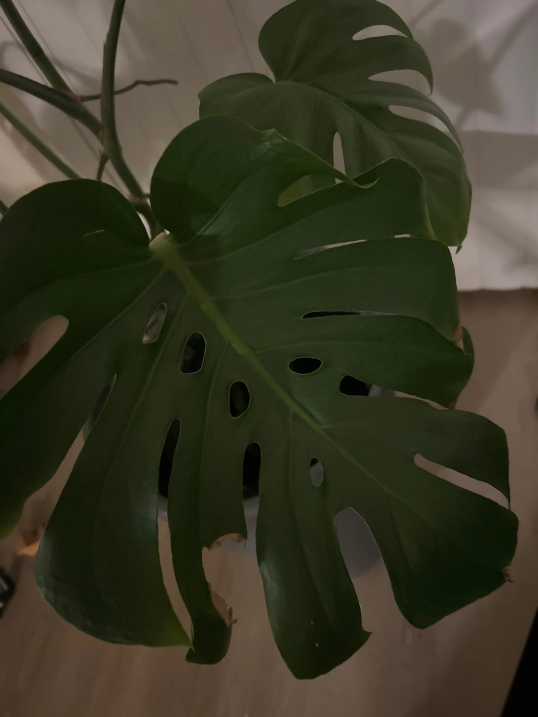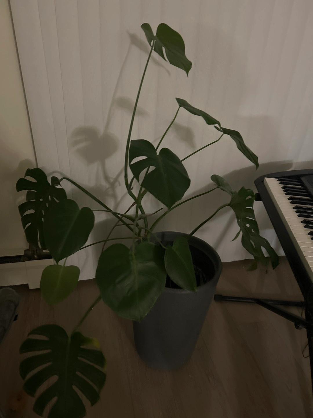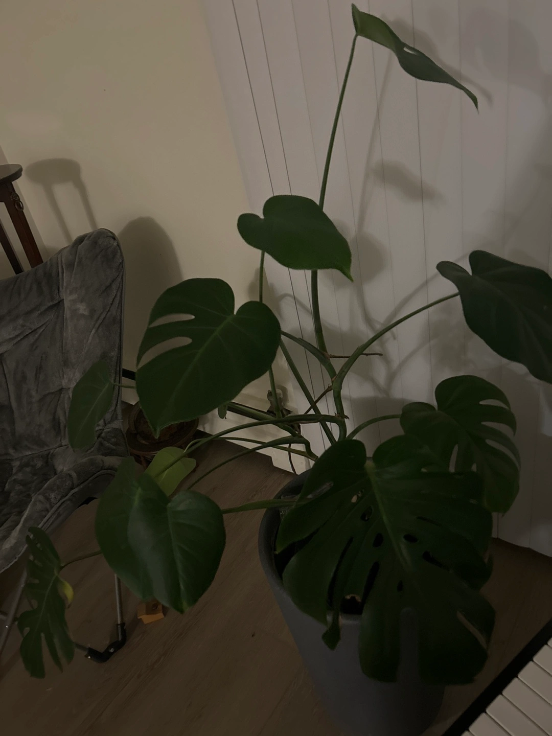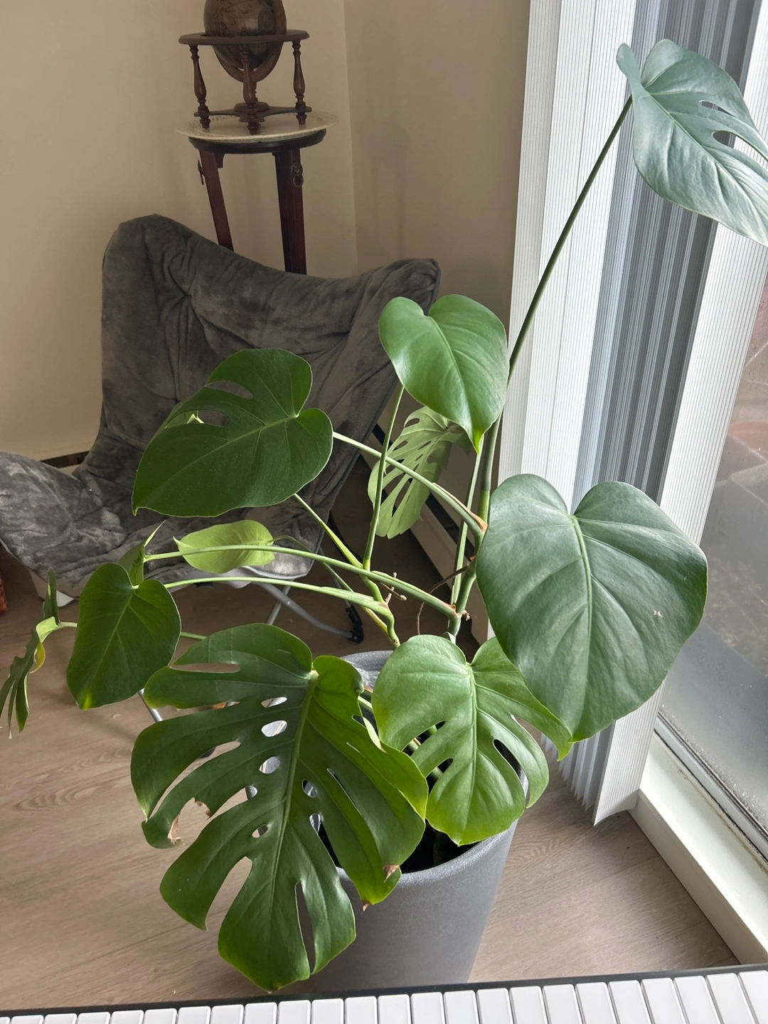 A healthy Monstera Deliciosa plant in a beautiful tall grey pot. It's a popular houseplant known for its unique, split leaves. This plant would liven up any room!