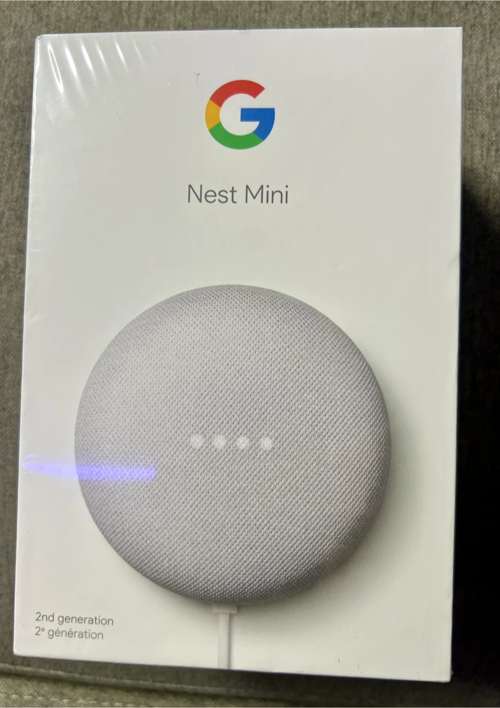 It's a Google Nest Mini, 2nd generation. This smart speaker comes in a light grey fabric finish. It's powered by Google Assistant for voice commands.