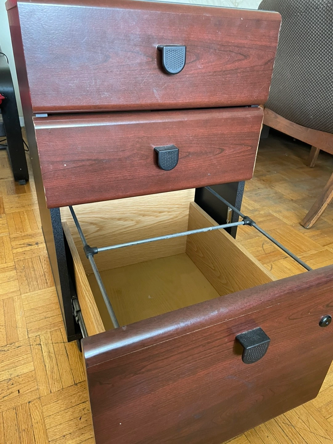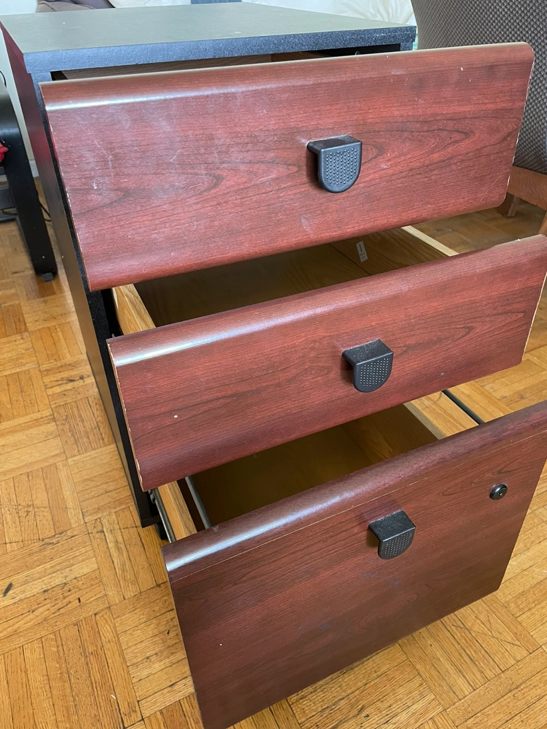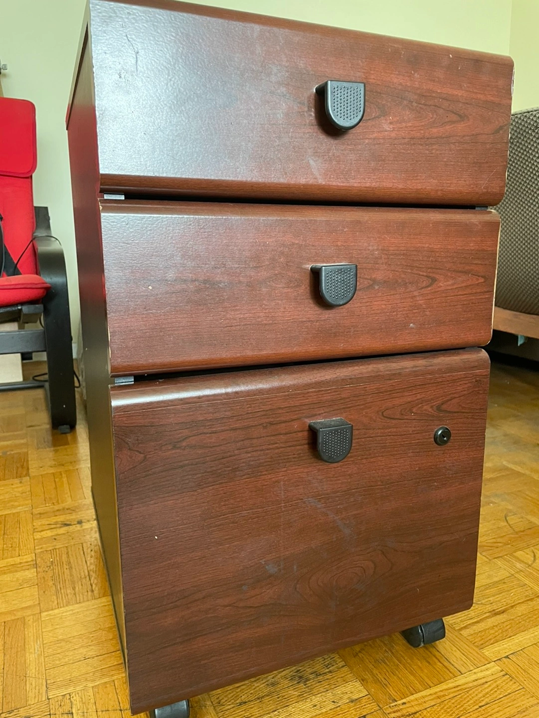 Mini filing cabinet without any keys but it’s unlocked.