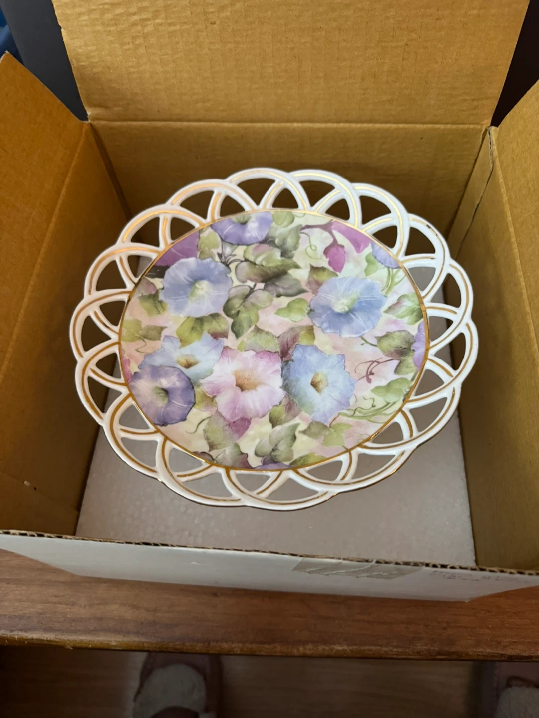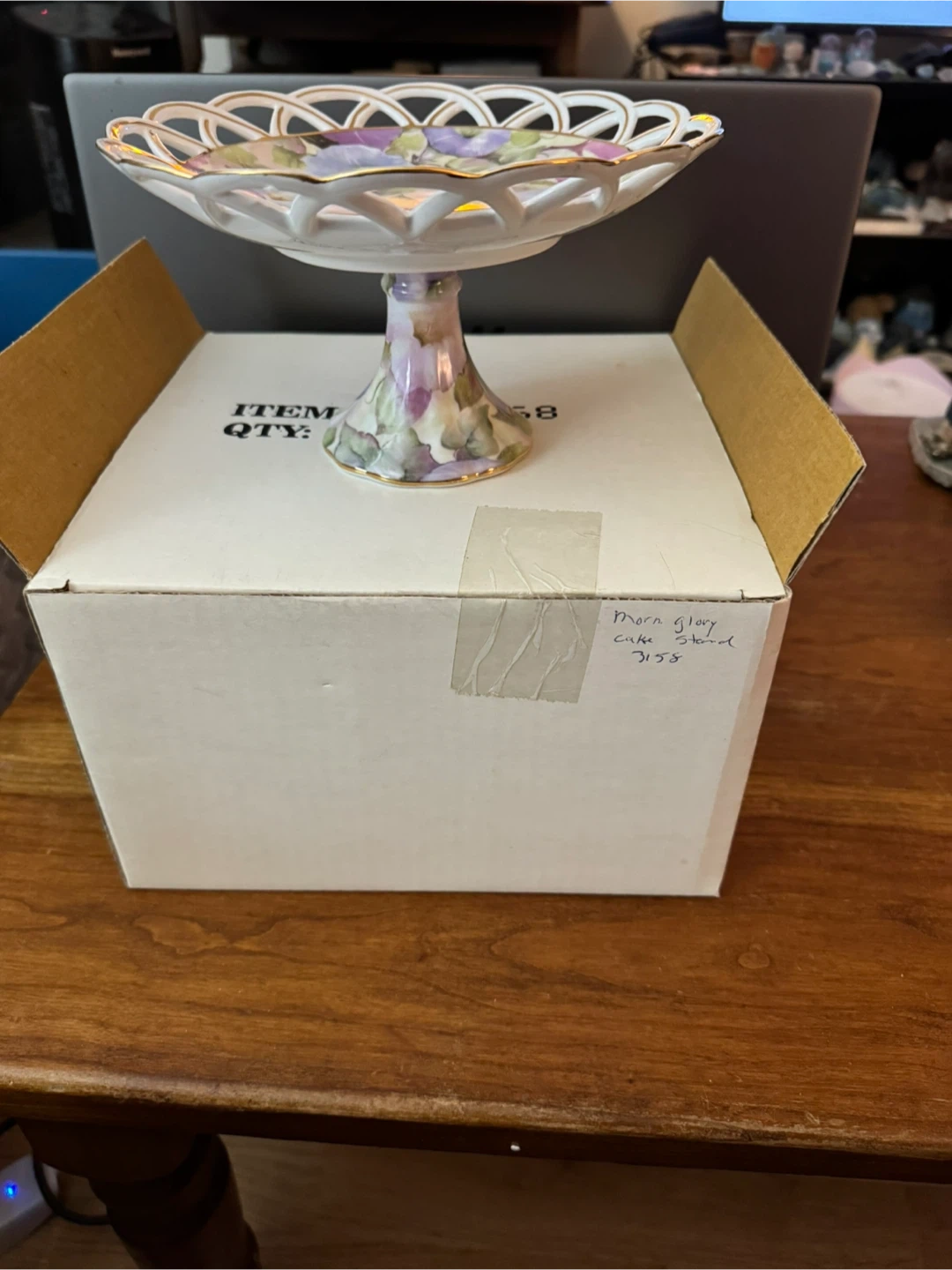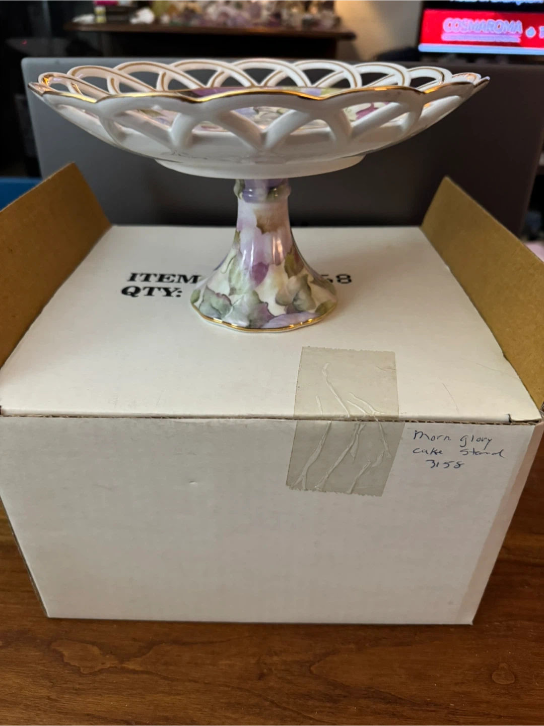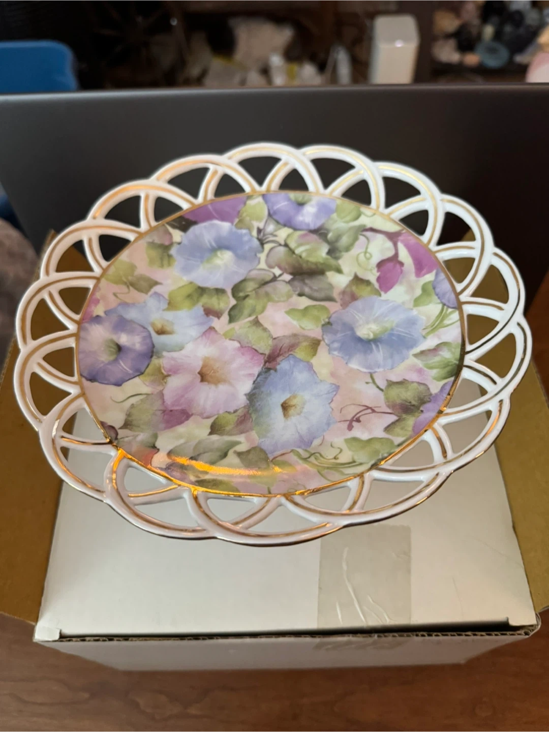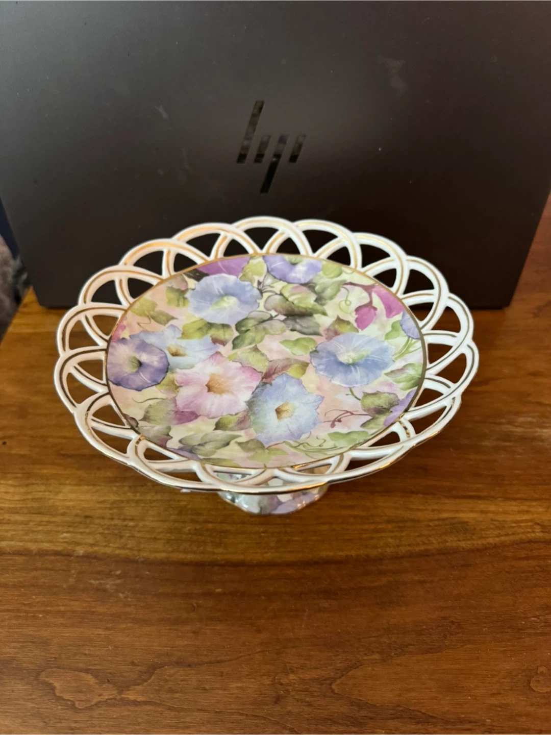 This elegant cake stand features a beautiful floral design with morning glories. It has a white latticed edge and gold trim. It's perfect for displaying cakes, pastries, or other treats at special occasions. The stand is made of ceramic.
