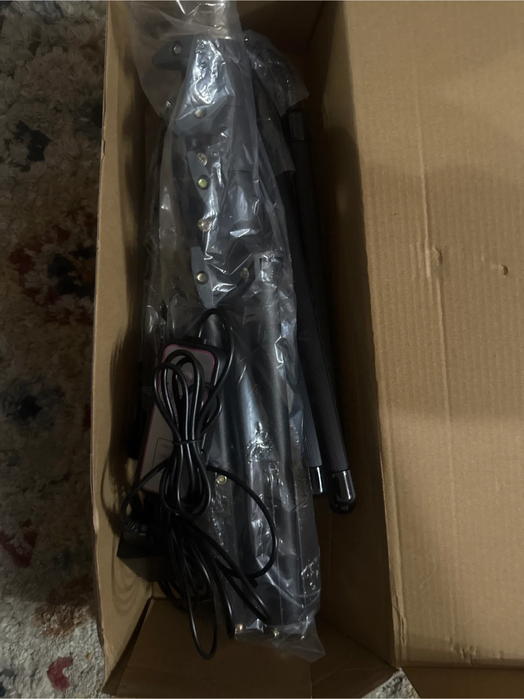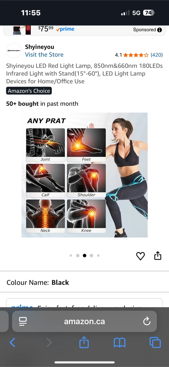 This ShineyYOU LED red light therapy lamp comes with a stand, adjustable from 15" to 60". It uses 850nm & 660nm infrared light for home or office use. The lamp is black and includes the original box and all components.