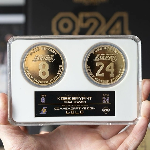 Gold plated Kobe Bryant Final Season commemorative coins. The set includes two coins with jersey numbers 8 and 24. Coins are 40mm and 24kt gold plated. Comes in a protective case with a label that has details about the coins. Condition: New. For Sale By: Owner.
