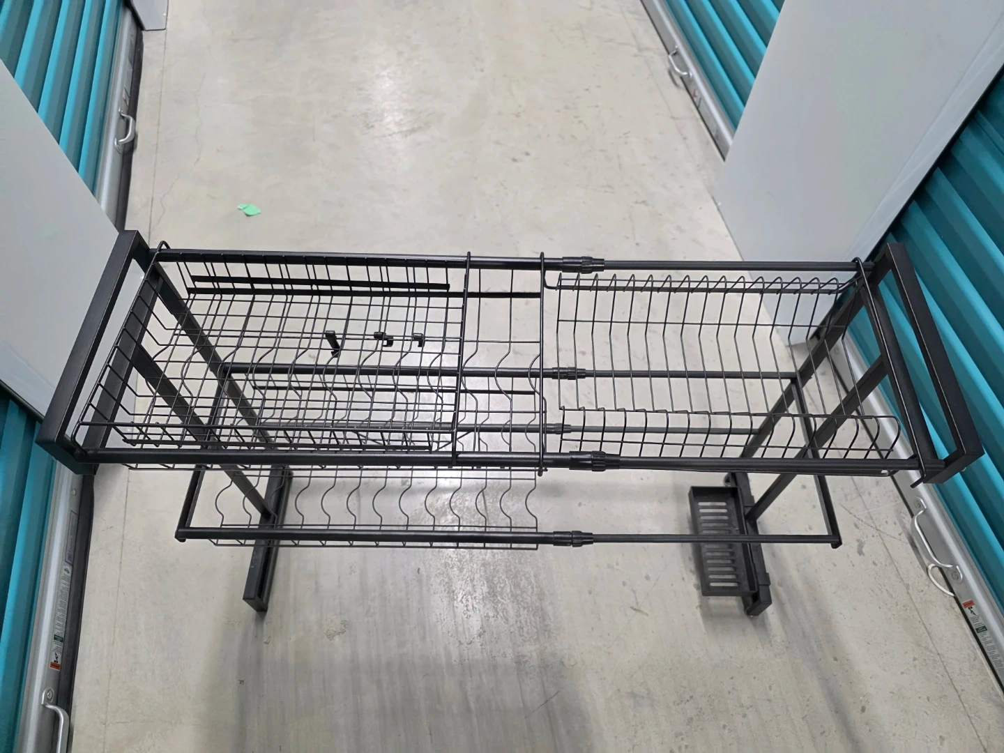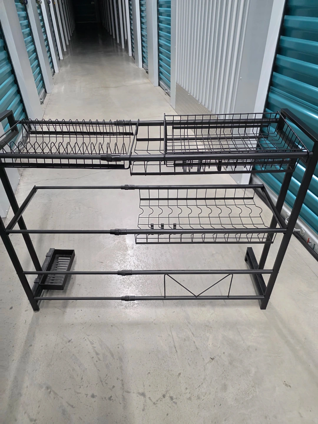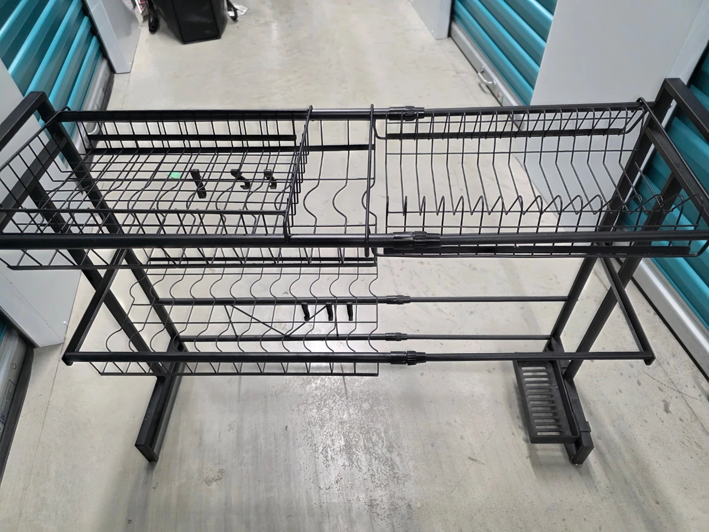This black metal dish drying rack features two tiers for ample drying space. It includes a small basket for cutlery and a drip tray. This rack is designed to sit over your sink, helping to maximize kitchen counter space.