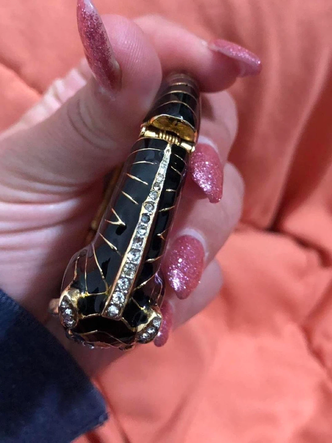 This striking bangle features a black panther head with red jeweled eyes and clear rhinestone accents. It's made of gold-tone metal with black enamel and gold-tone striping. The hinged design allows for easy wear. A bold statement piece for any jewelry collection!
