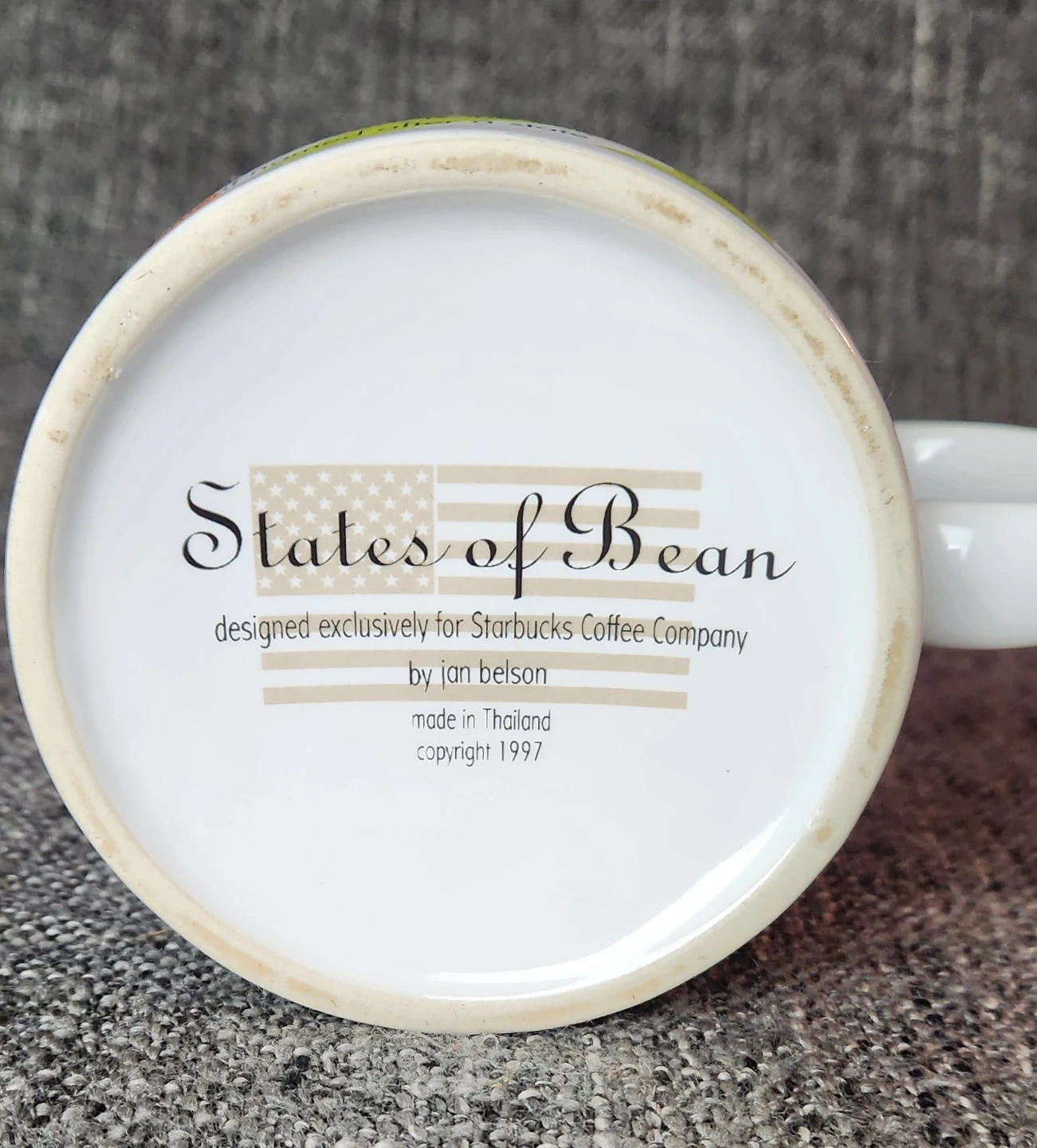 This Starbucks coffee mug from 1997 features the "States of Bean" pattern designed by Jan Belson. It holds 14 oz of hot or cold beverages and is dishwasher safe. The mug is made of ceramic and porcelain.