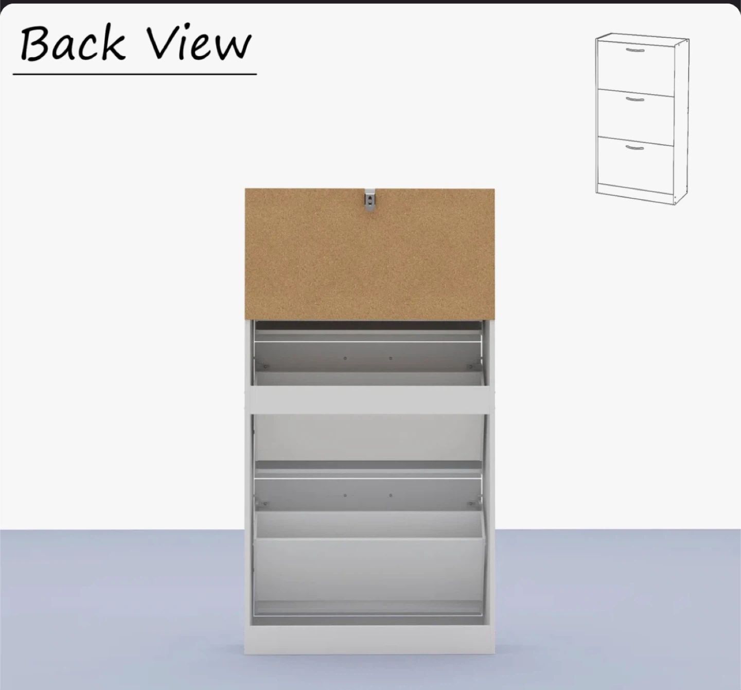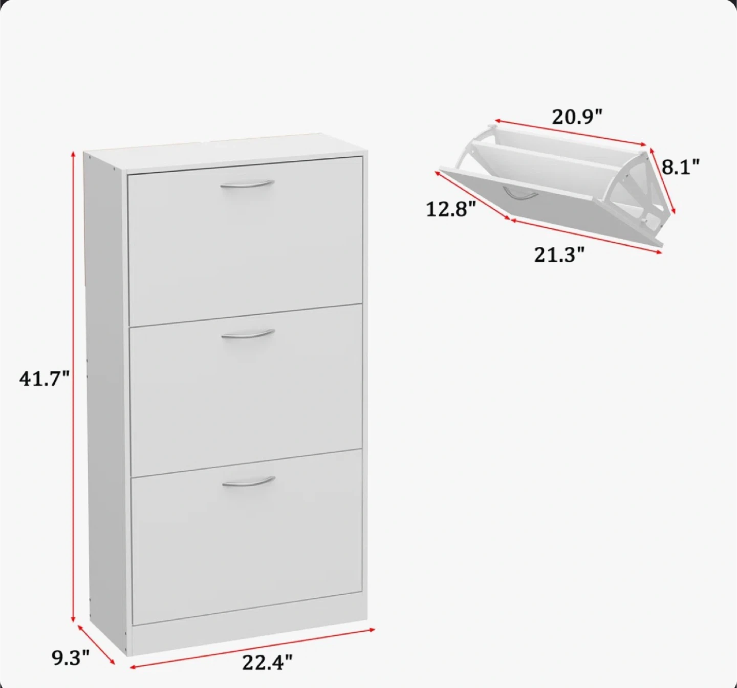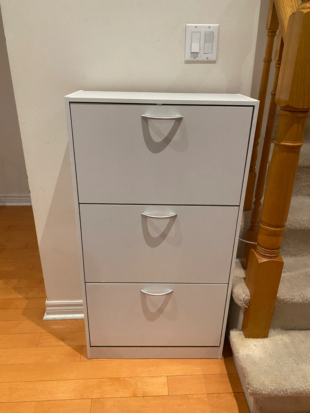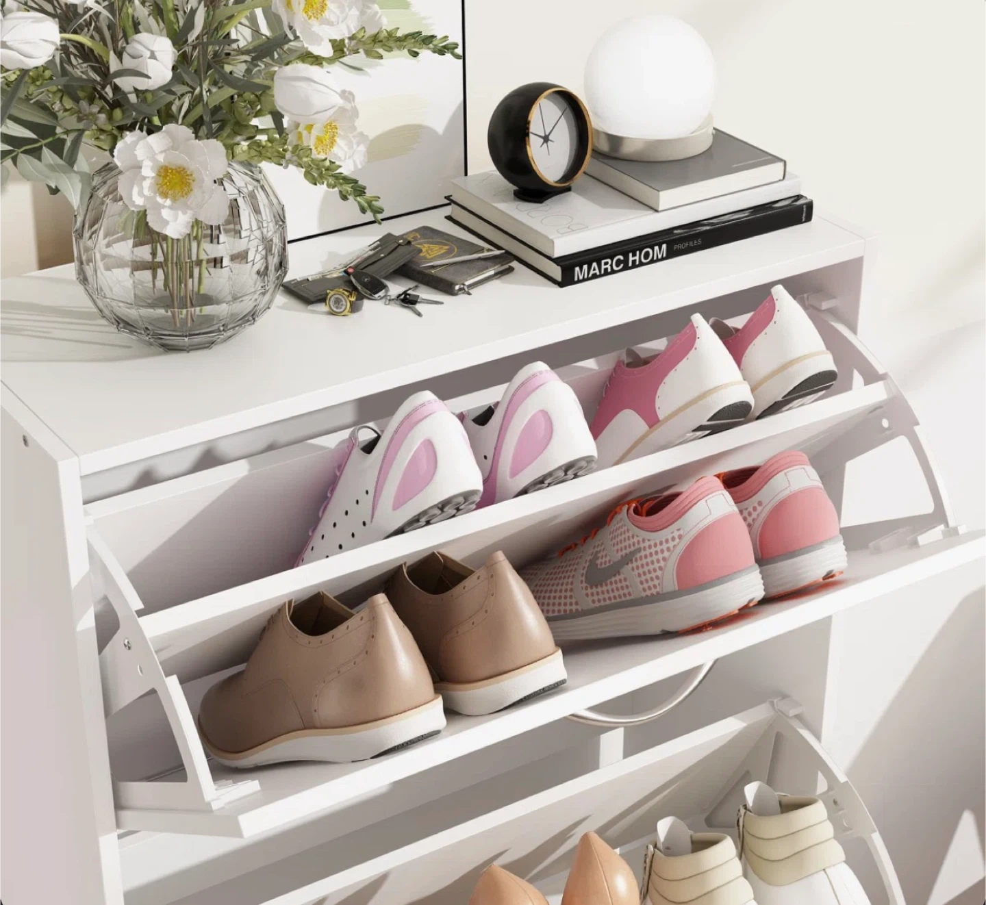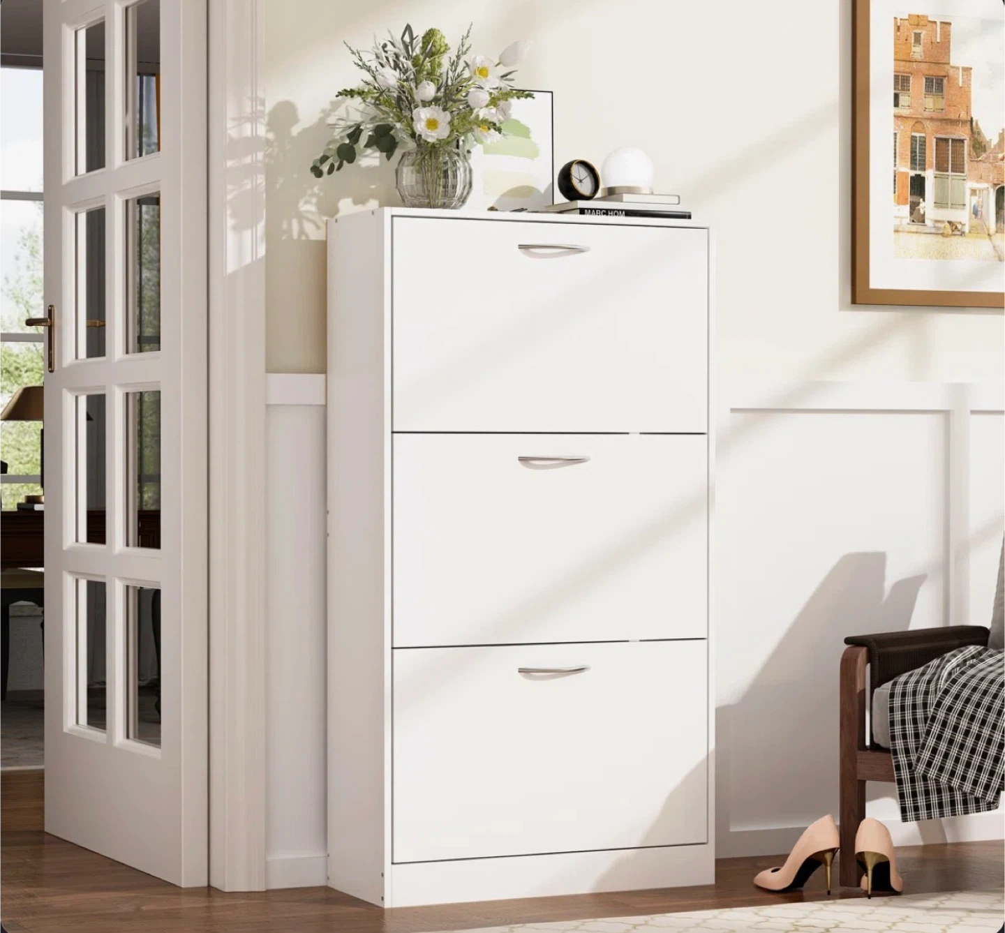 This white shoe cabinet features three flip-down drawers for convenient storage. It's made of durable material and has a clean, modern design. It helps keep your entryway tidy and shoes organized!