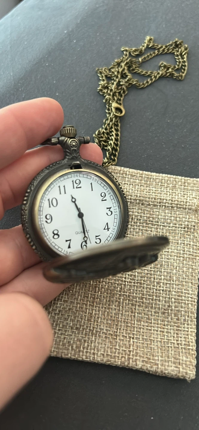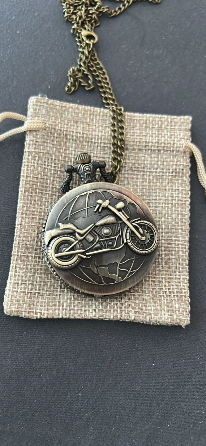Bronze-tone pocket watch featuring a motorcycle design on the front and ornate scrollwork on the back. It includes a long chain and comes with a protective pouch. This timepiece is perfect for adding a unique touch to any outfit or for collectors.