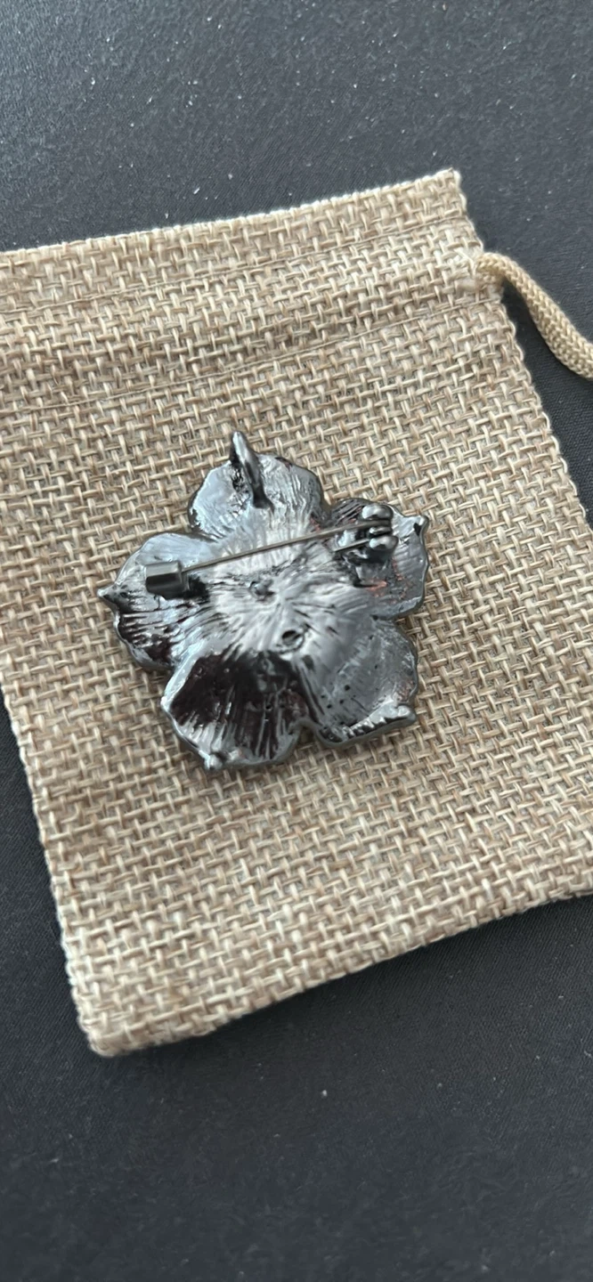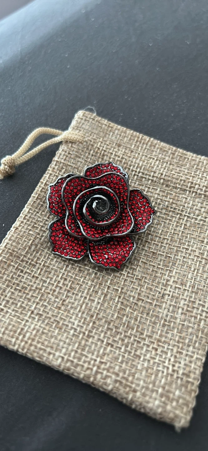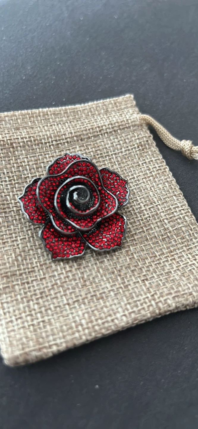 Sparkly red rose brooch, adorned with rhinestones. It features a classic rose design with a detailed metal setting. Comes with a small burlap pouch for storage.
