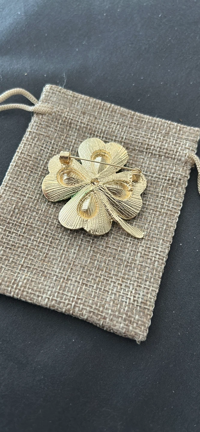 This charming brooch features a four-leaf clover design, embellished with sparkling green rhinestones. It's crafted with a gold-tone finish and includes a secure pin backing. Perfect for adding a touch of luck to any outfit!