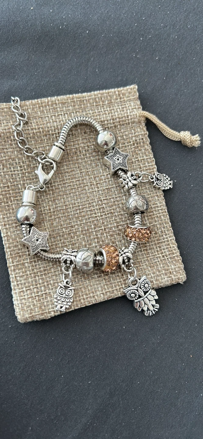 This charming bracelet features multiple owl and star charms, along with sparkling beads. It comes with a small protective pouch. The silver-toned metal gives it a classic look.