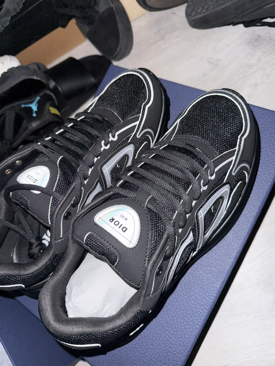Dior B30 sneakers in black microfiber mesh. These shoes feature a contemporary design and are crafted with quality materials. They include the original box for storage. Perfect for everyday wear or adding a stylish touch to your outfit!