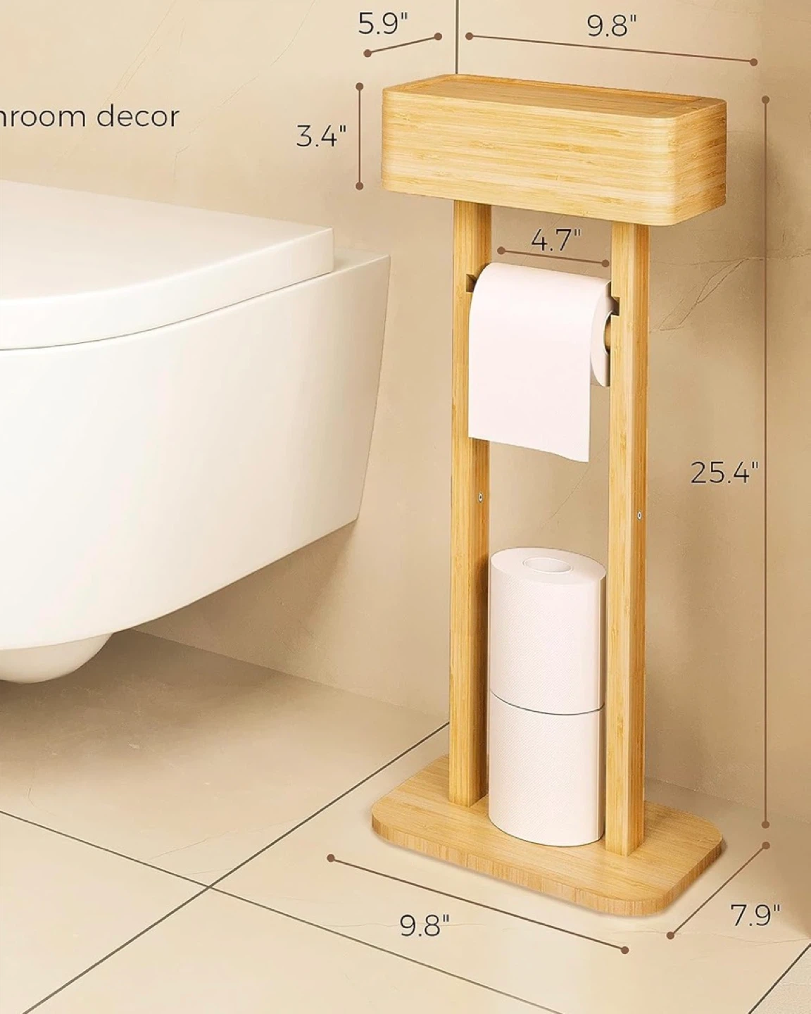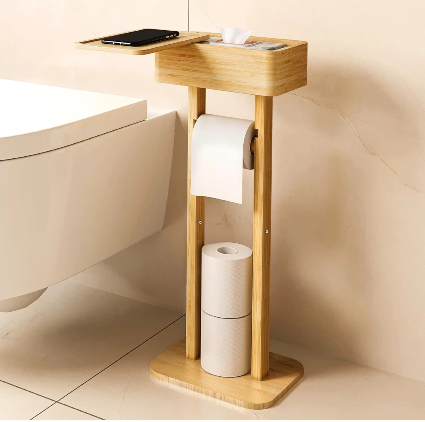 This 4-in-1 multifunctional bamboo toilet paper stand offers a paper roll holder and spare roll storage. It features a top storage box with a 360° rotatable lid that acts as a temporary desktop for your phone or other small items. It's a handy addition to any bathroom!
