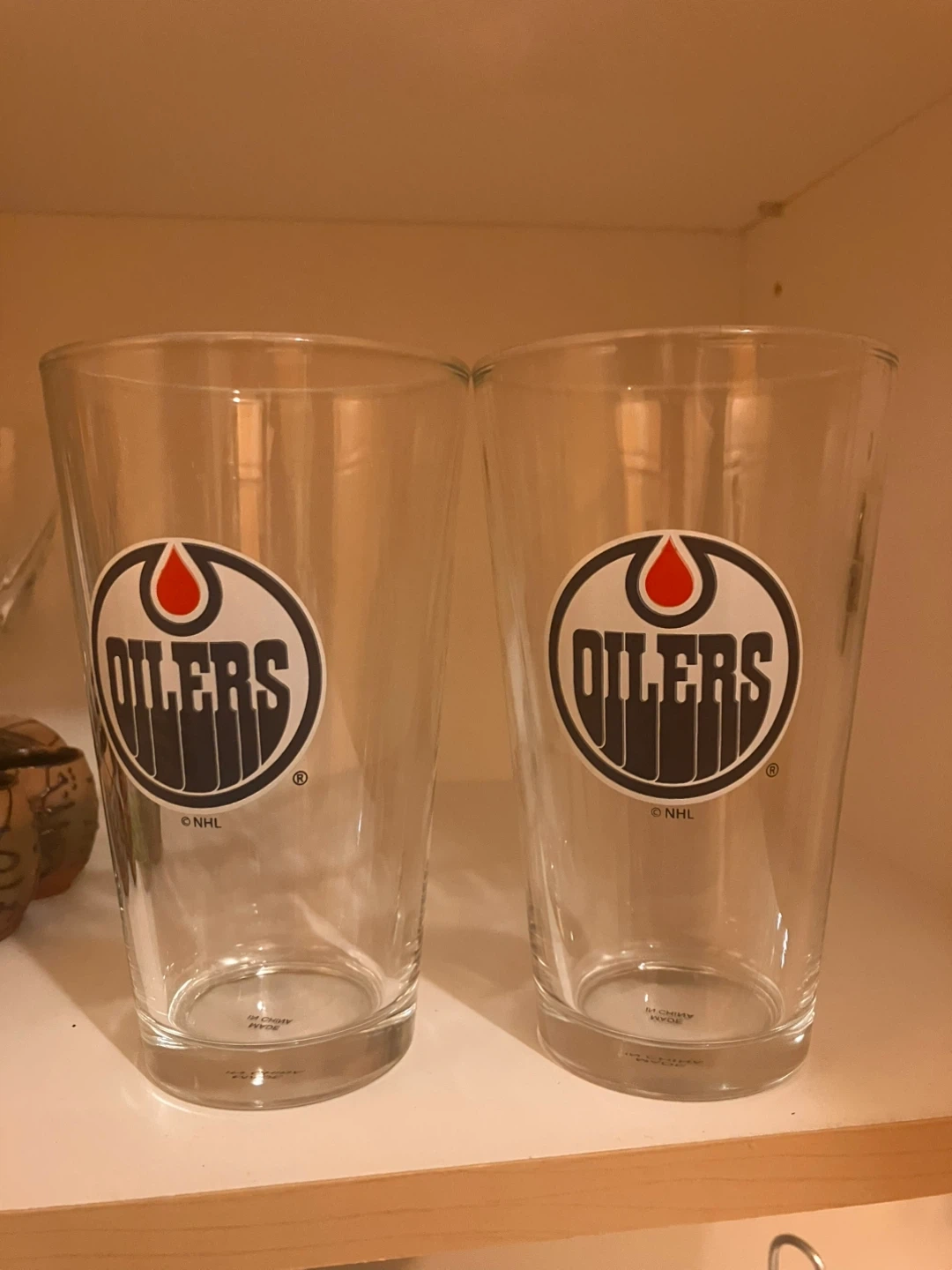 Two clear pint glasses featuring the Edmonton Oilers logo. These glasses are made of glass. Perfect for game night!