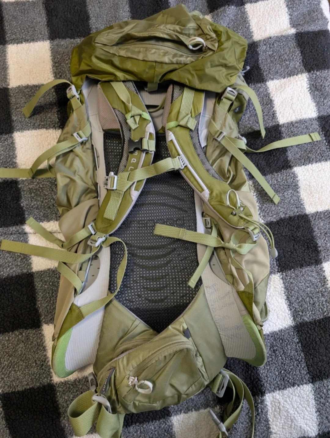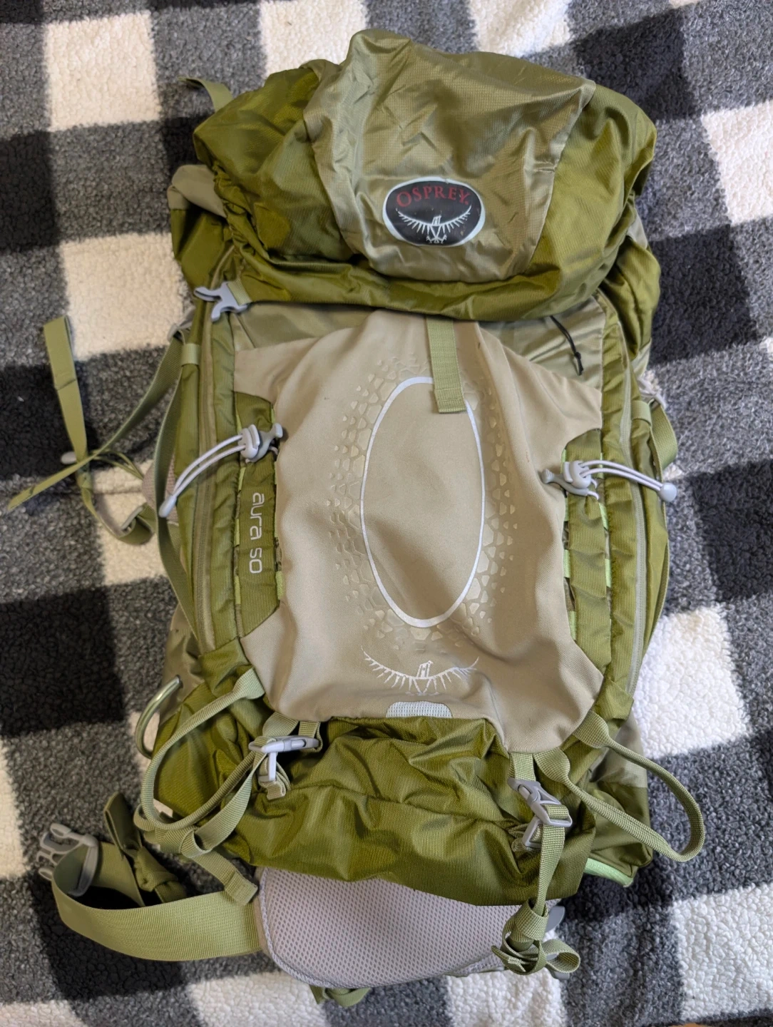This Osprey Aura 50 backpack is a great choice for your next adventure. It's a versatile pack designed for comfort and carrying capacity. Perfect for multi-day hikes and camping trips! Some pen on strap.