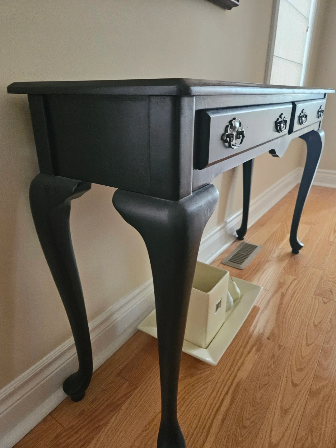 Console table with a dark grey finish. It has two drawers with decorative handles. The legs are curved and feature a traditional design. Made of wood. Perfect for an entryway or hallway!