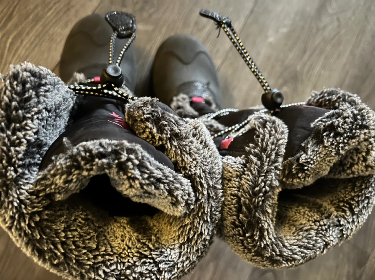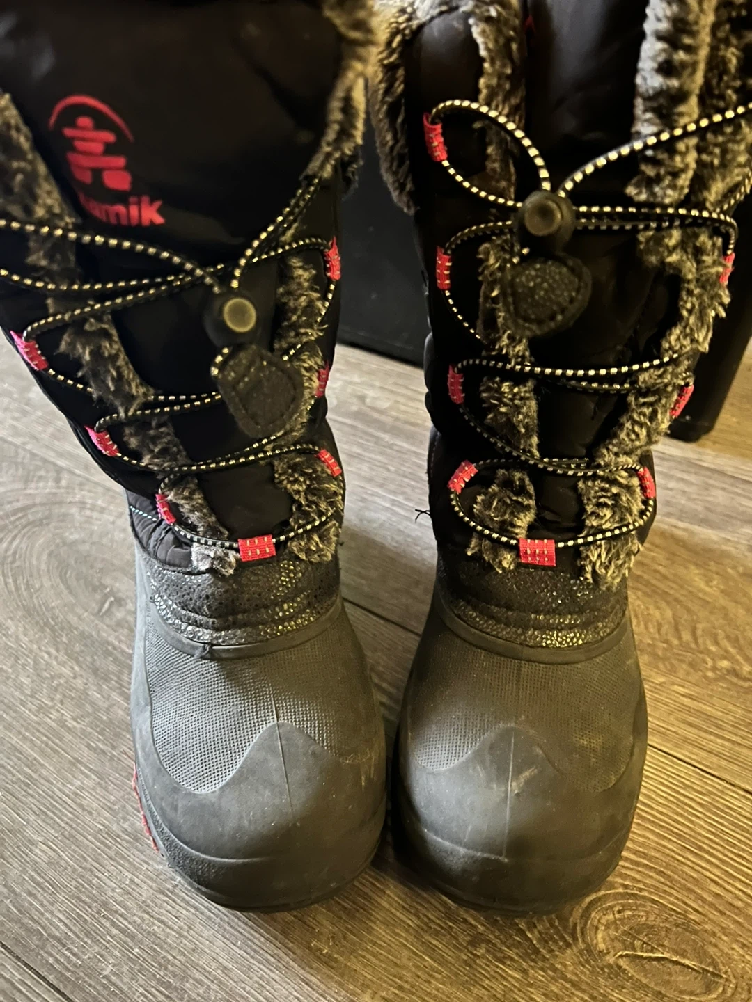 These black Kamik boots feature a cozy faux fur lining and colourful stitching details. They're waterproof, perfect for keeping toes warm and dry during winter adventures. The drawstring closure ensures a snug fit.
