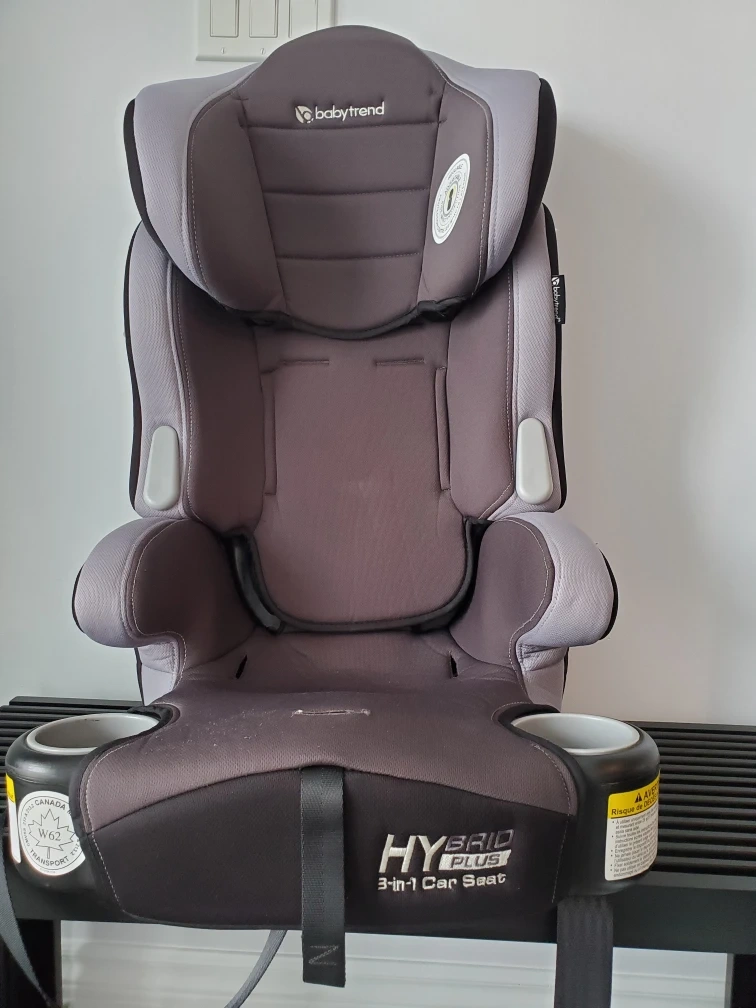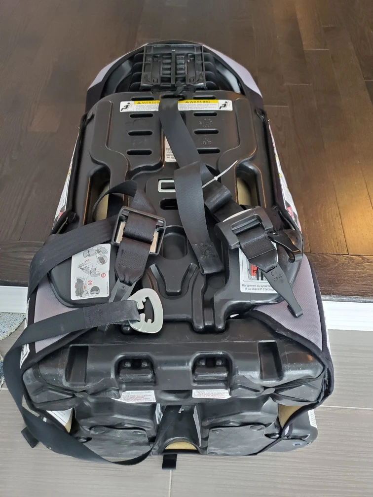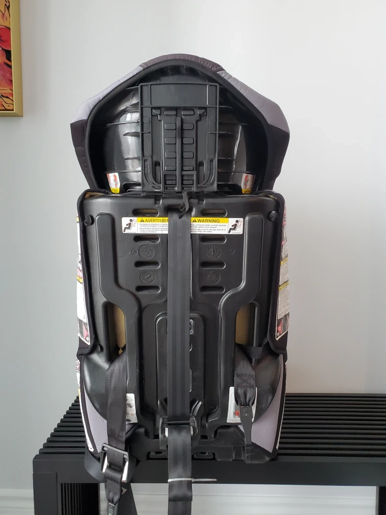 NOTE: The inside safety harness/buckle was removed so that the car seat could be used as booster seat only. Unfortunately, they are now misplaced. Price reflects this, but you can use a three-point harness if you purchase it separately and just slip it through. The buckles to secure the carseat to the vehicle seat ARE present though.