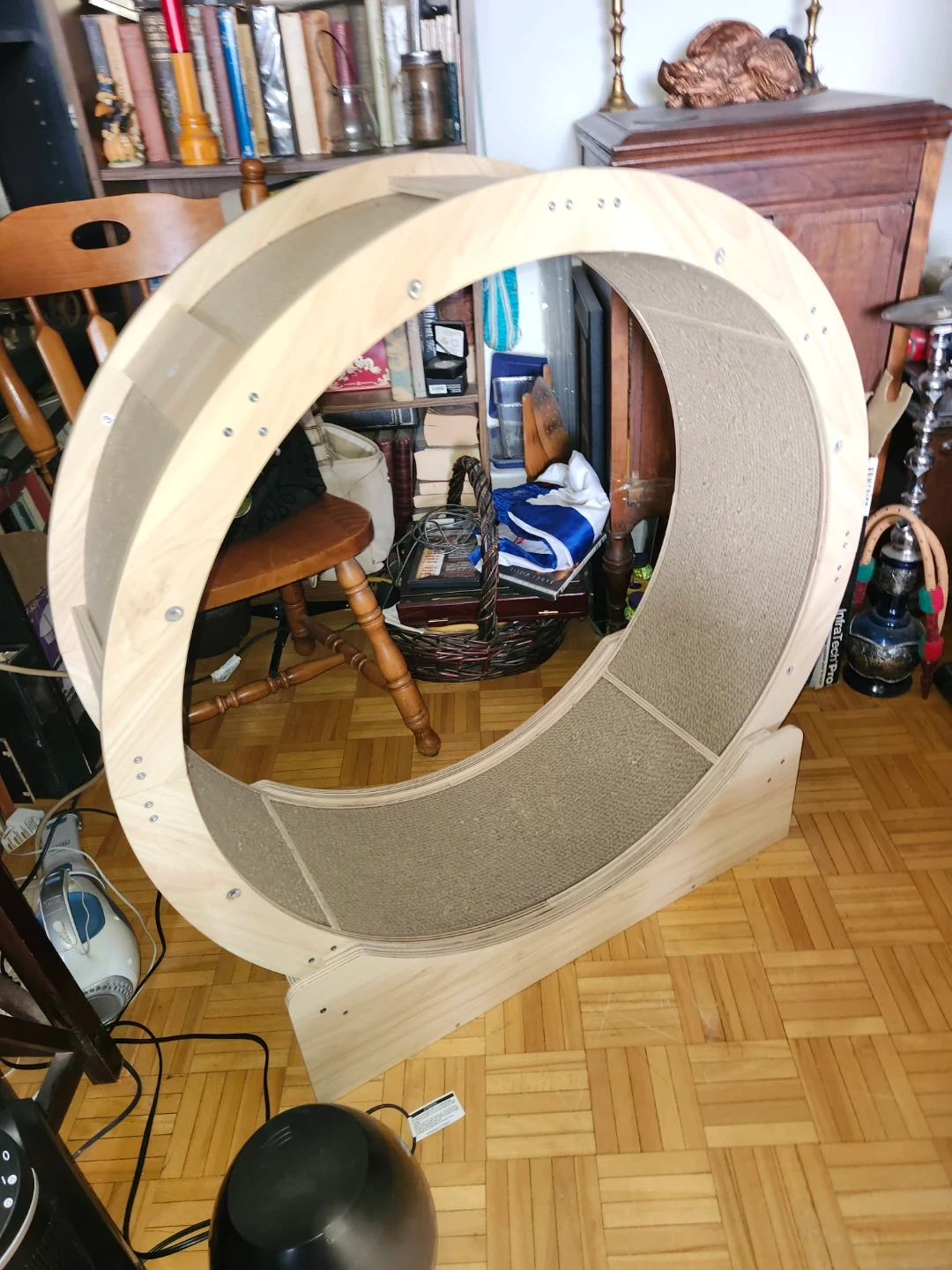This cat wheel is constructed from light-coloured wood and features sisal rope for scratching. It's designed to provide exercise and entertainment for your feline friends. The wheel's surface is a durable sisal material. For LARGE cat. Biggest wheel I could find only for my cat to not want it.🤦♂️