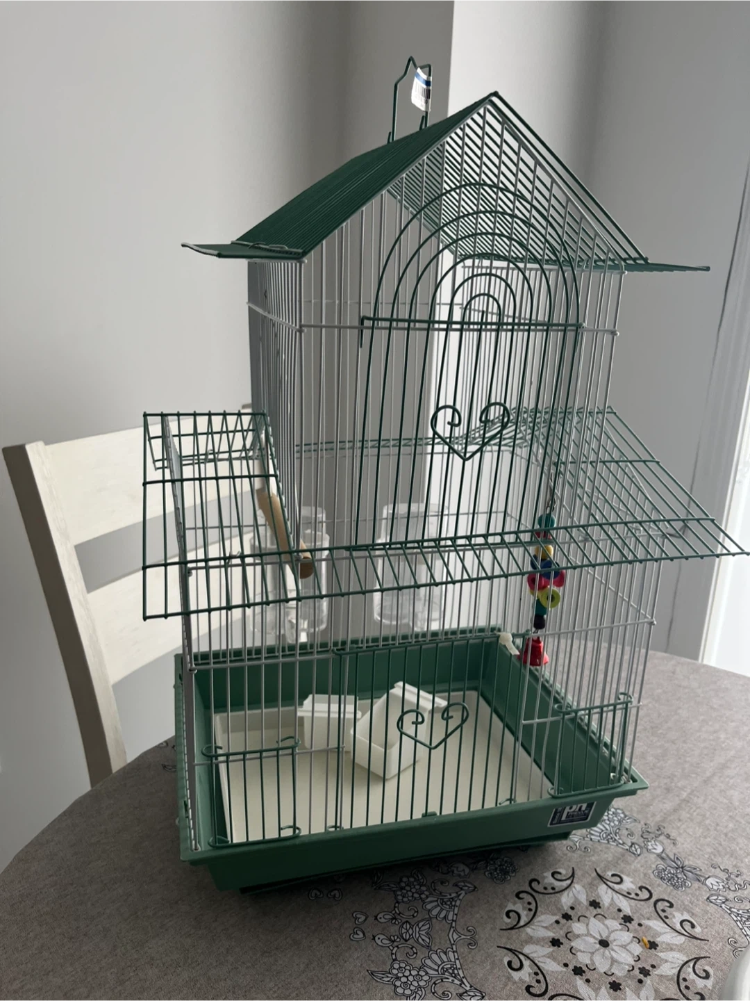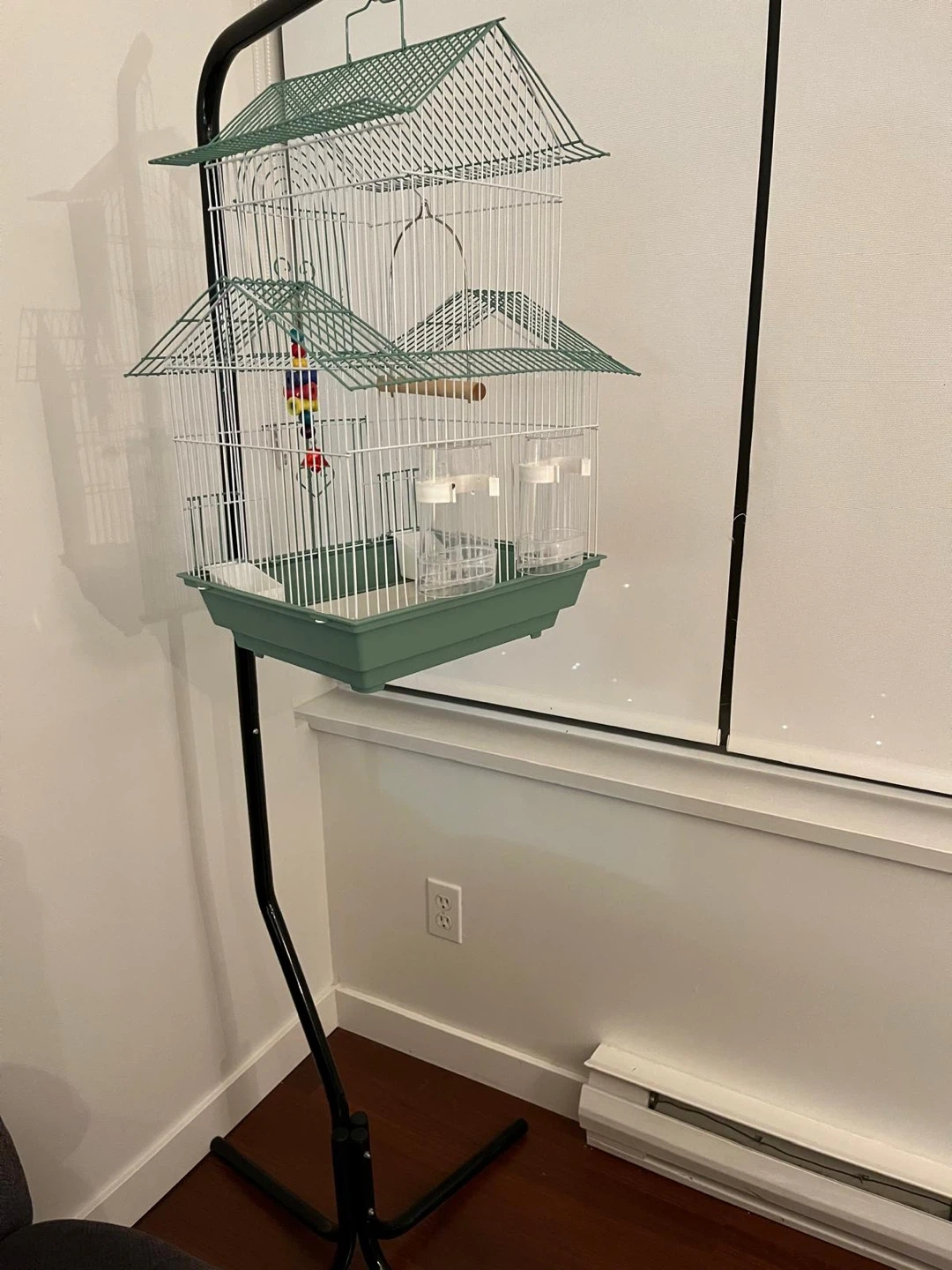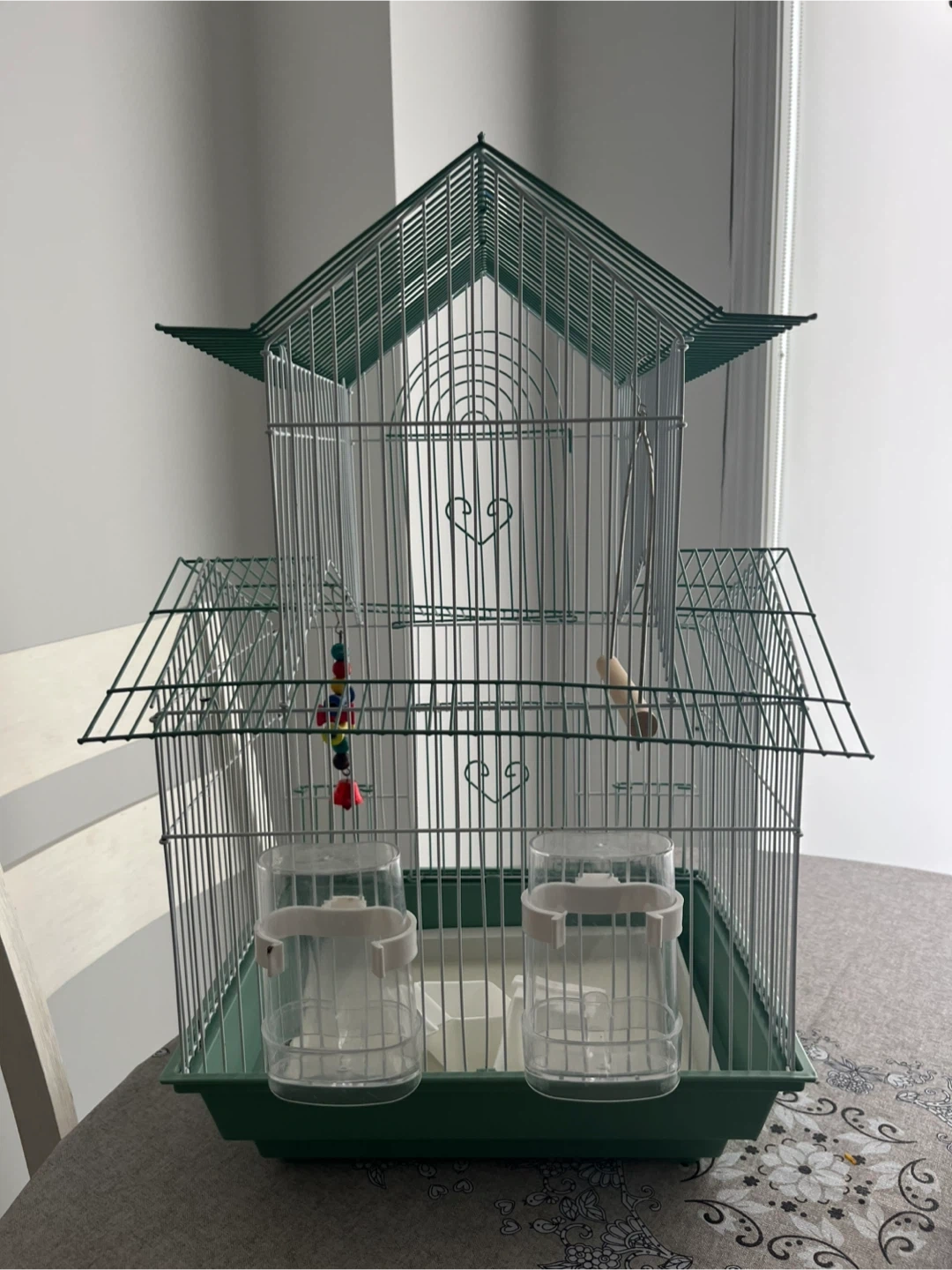 This bird cage is green . It includes two food and water cups and a perchand come with stand . There's also a small toy with colourful beads. It's perfect for small birds like parakeets or finches.