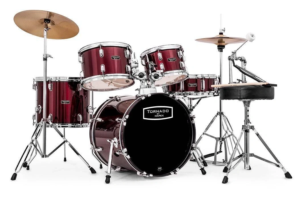 This is a Mapex Tornado drum kit in a deep red finish. It includes a bass drum, snare drum, two mounted toms, and a floor tom. Two cymbals and stands are also included, along with a bass drum pedal and drum stool. Perfect for beginner drummers!