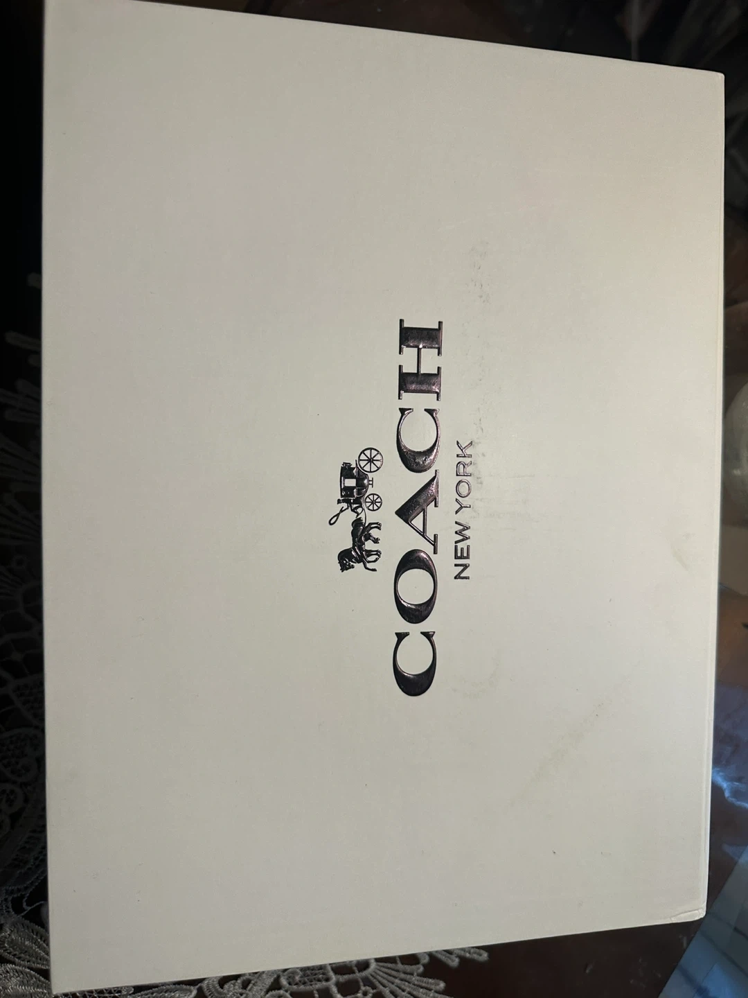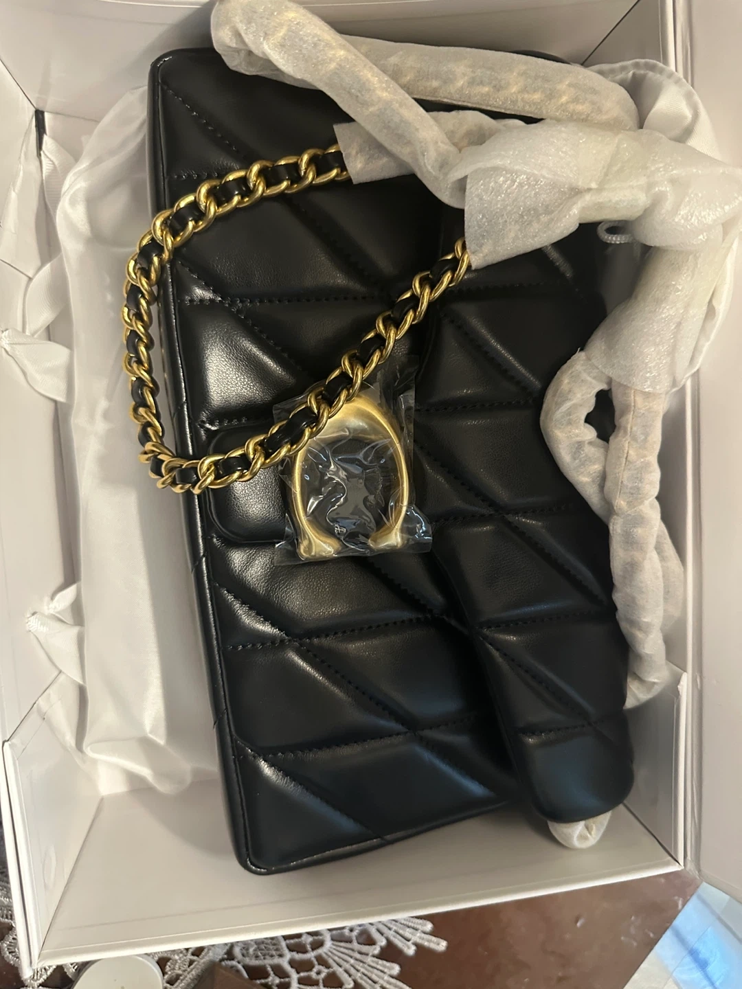 This is a Coach shoulder bag in black quilted leather. It features a gold-tone chain strap and hardware. The bag comes in its original Coach box with a dust bag. It's perfect for a night out or everyday use!