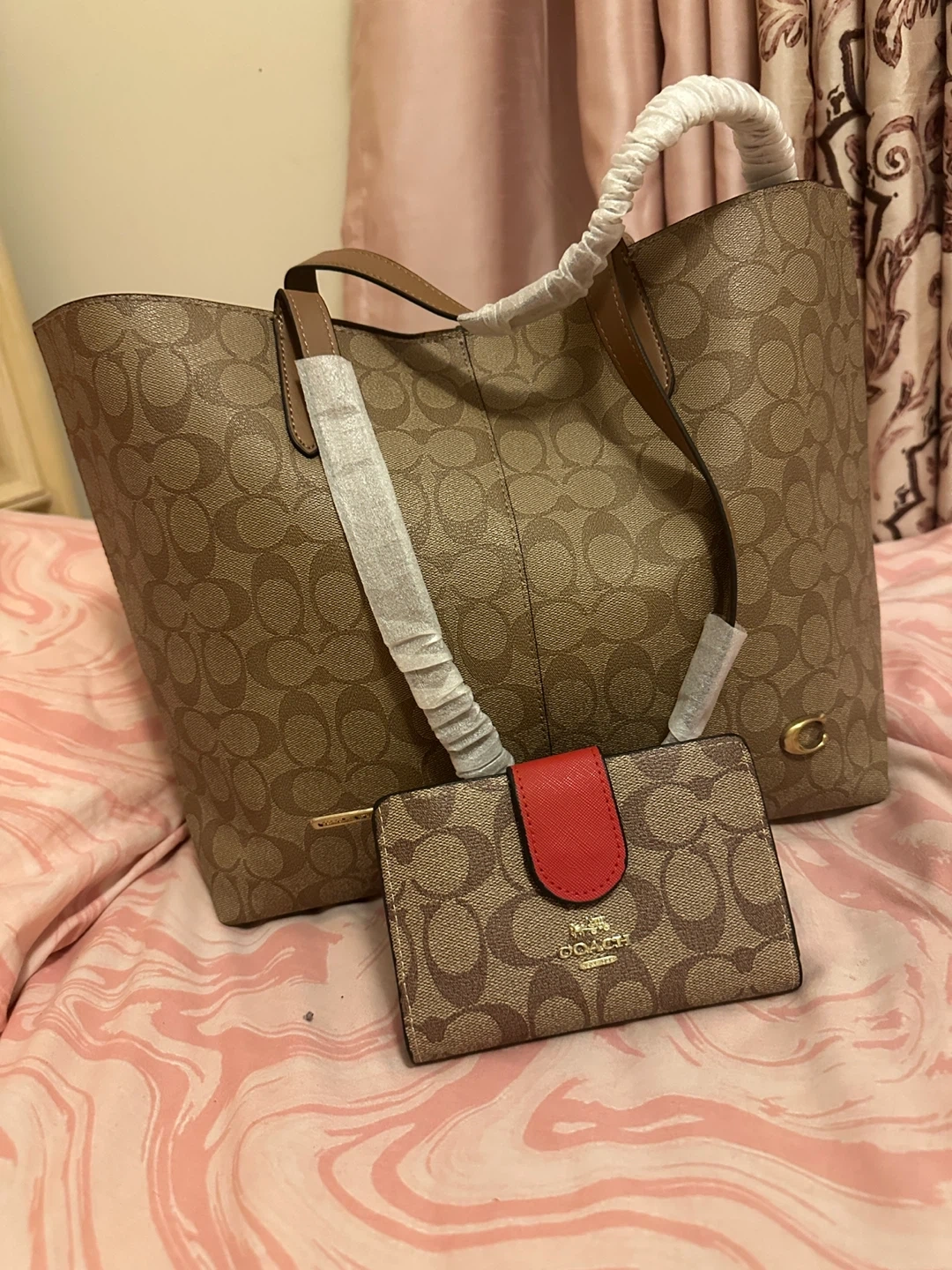 This is a Coach signature canvas tote bag and matching wallet. It's a classic brown and tan monogram print with leather trim. The set includes the tote and a small bi-fold wallet with a red snap closure.