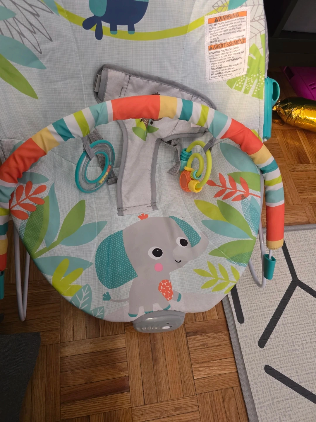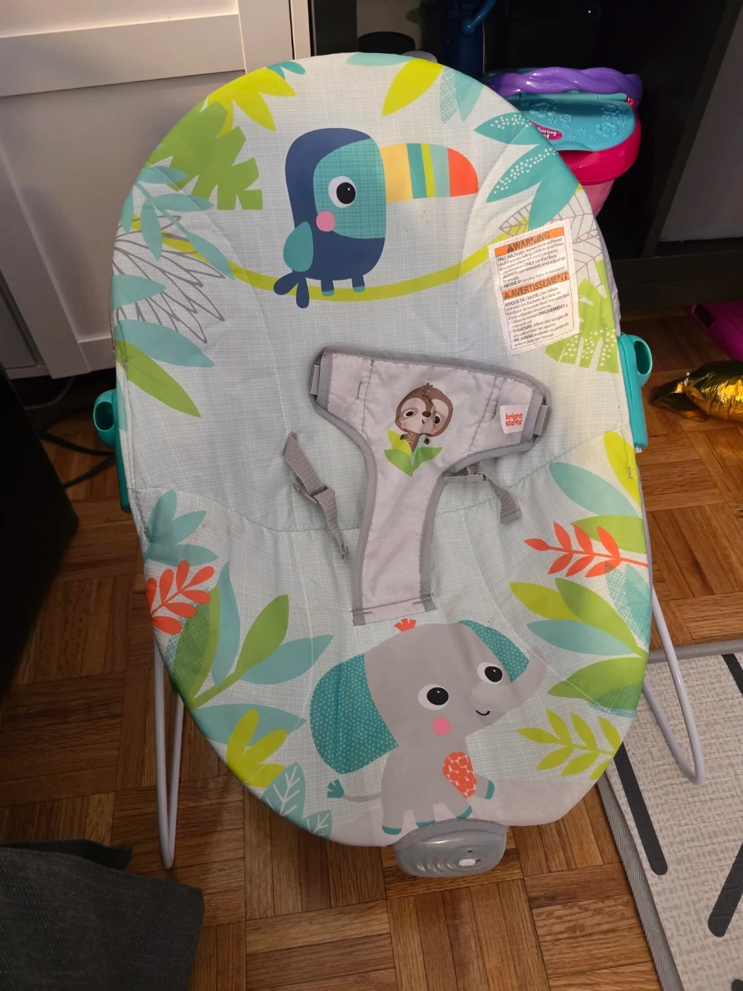 This used Bright Starts baby bouncer features a playful jungle theme with an elephant and toucan. It includes a removable toy bar with rattles for baby's entertainment. Suitable for infants.