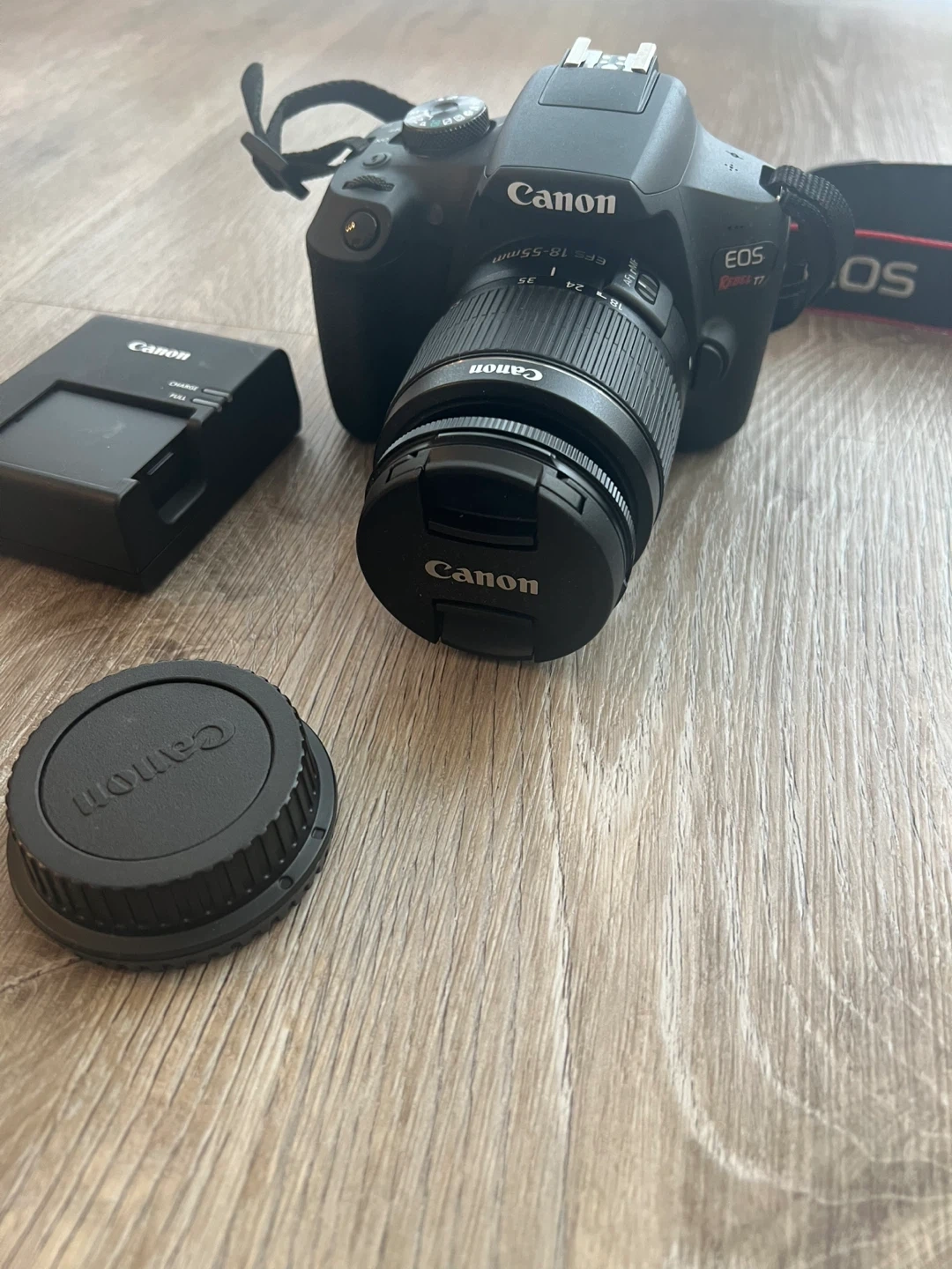 Canon EOS Rebel T7 DSLR camera with an 18-55mm lens. It comes with a charger and lens cap. This camera is great for capturing high-quality photos and videos. Purchased from Best Buy few month ago. Used only once or twice.