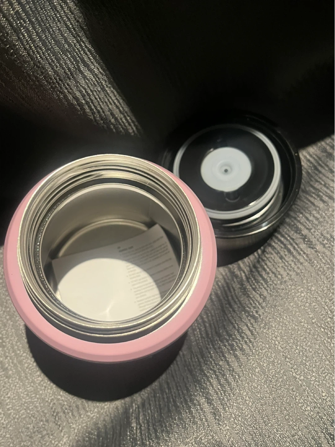 This Thermos food jar is vacuum insulated and made of stainless steel. It's designed to keep food hot or cold for hours. Comes with a built-in spoon.