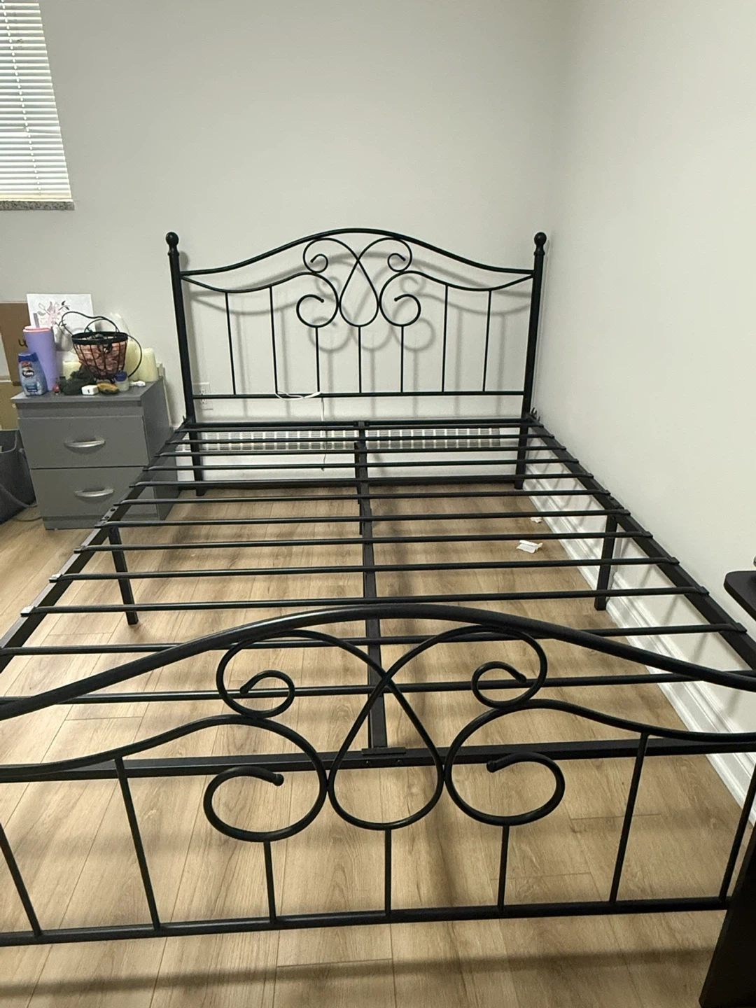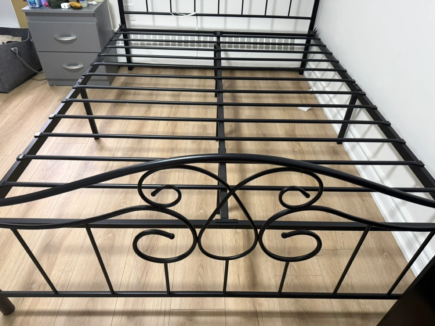 Sturdy black metal bed frame featuring a decorative scrolled headboard. It's designed for durability with strong support slats. This frame is a great option for adding a touch of classic style to any bedroom.