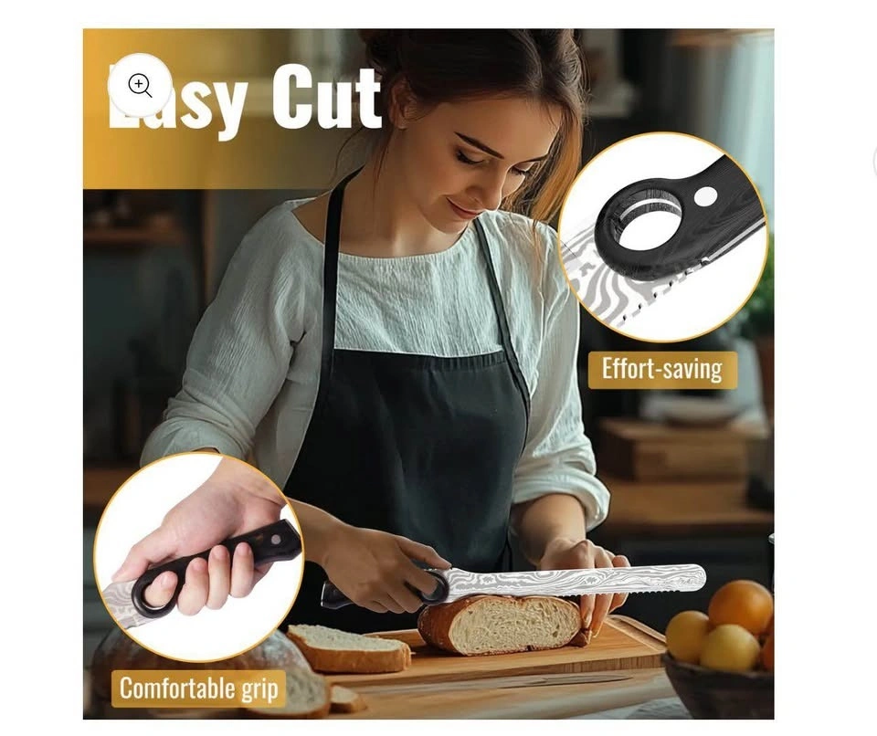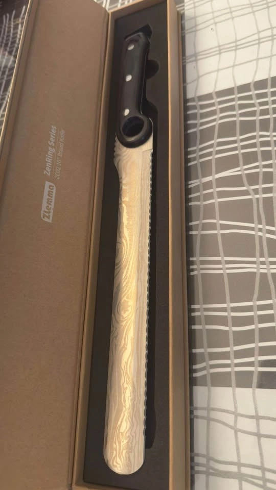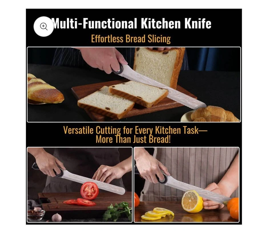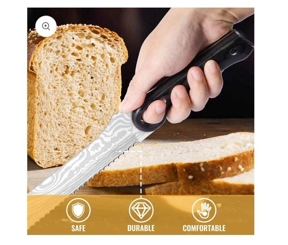 Brand new, never used. This 10-inch serrated knife features a full-tang construction with a durable 5Cr15MoV steel blade and an ergonomic Pakka wood handle. The unique finger ring offers enhanced safety and control, while the laser-etched Damascus pattern adds a touch of style. Perfect for slicing bread, fruits, and vegetables. Pickup in Milcroft, Burlington. No returns, please inspect during pickup. Check out my other listings for great deals on new items!