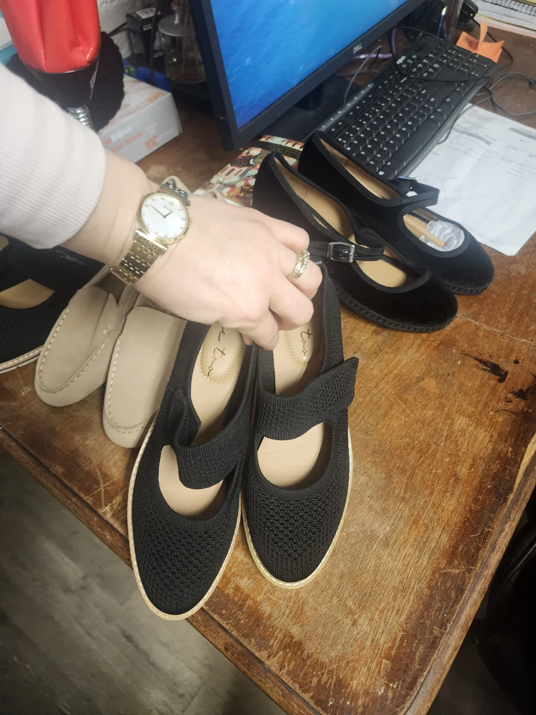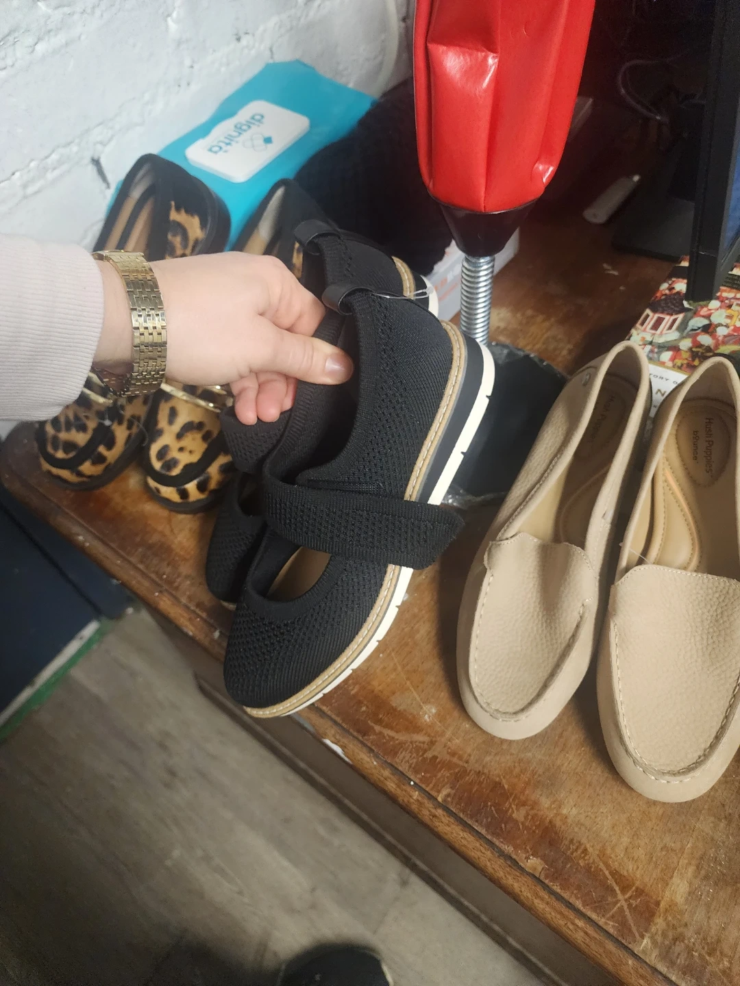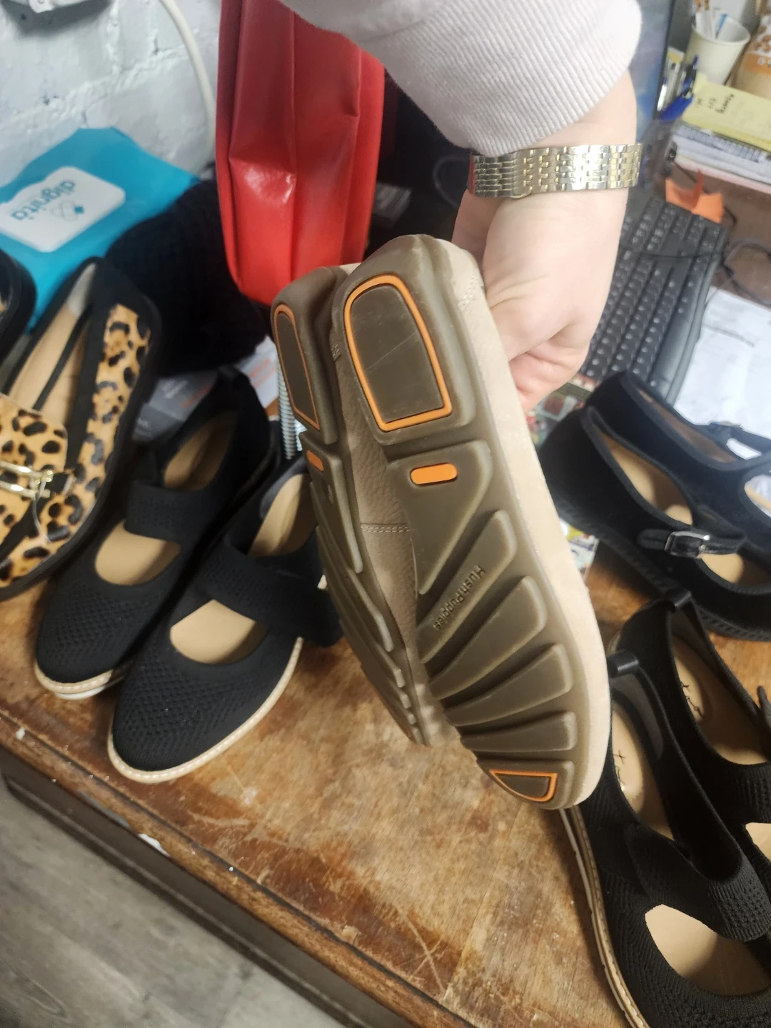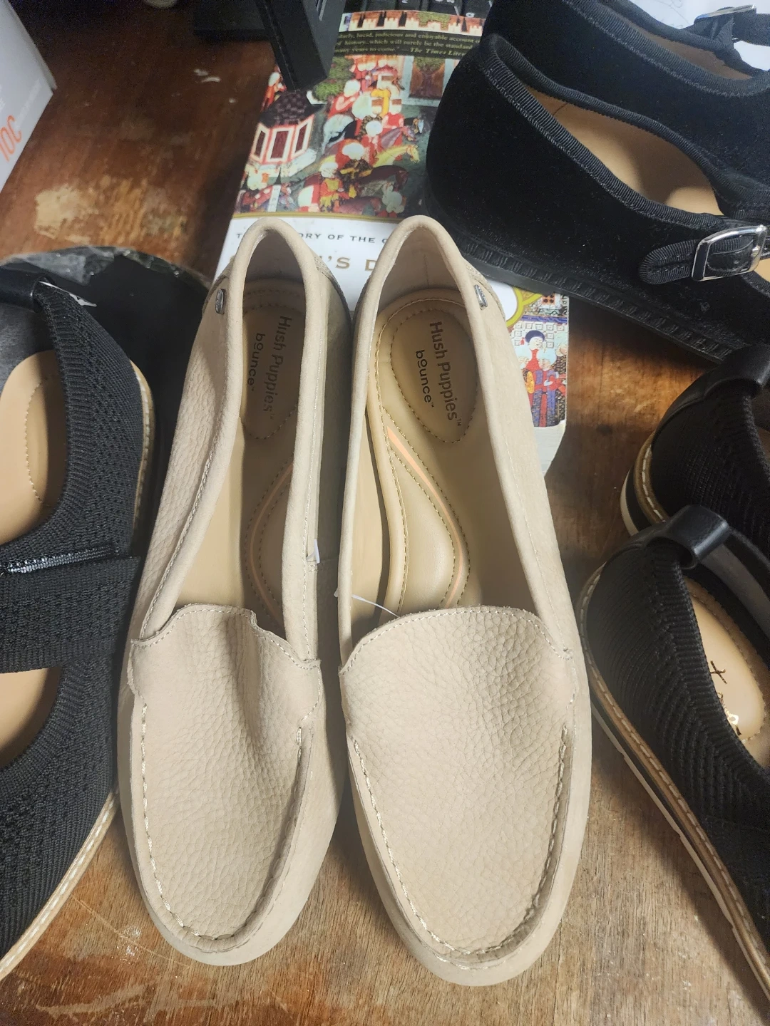 Bundle of women's flats including leopard print loafers by "me too" and black knit mary janes. Also includes beige loafers with "Hush Puppies" branding on the sole. Various sizes and materials.all those shoes for $60
