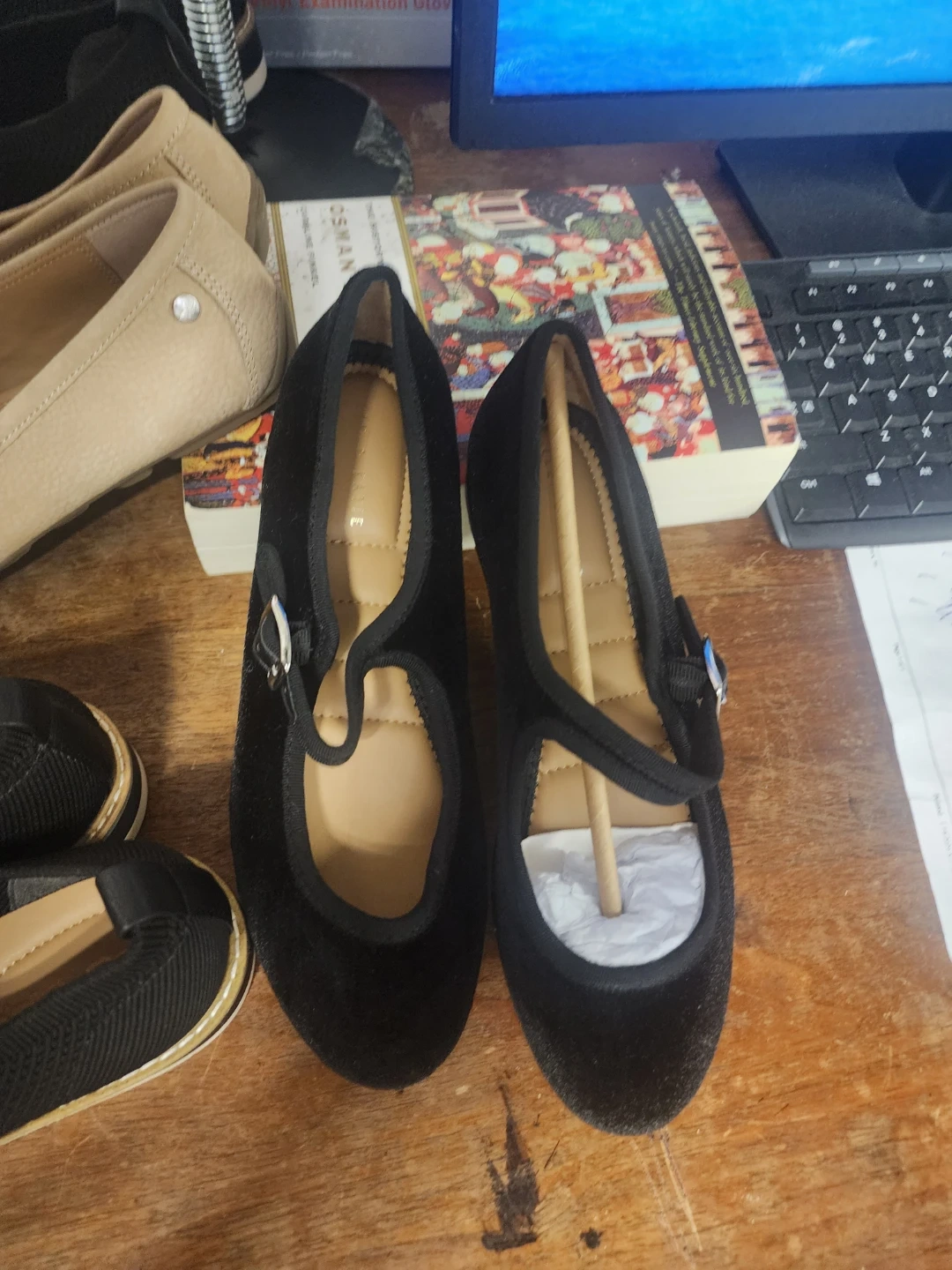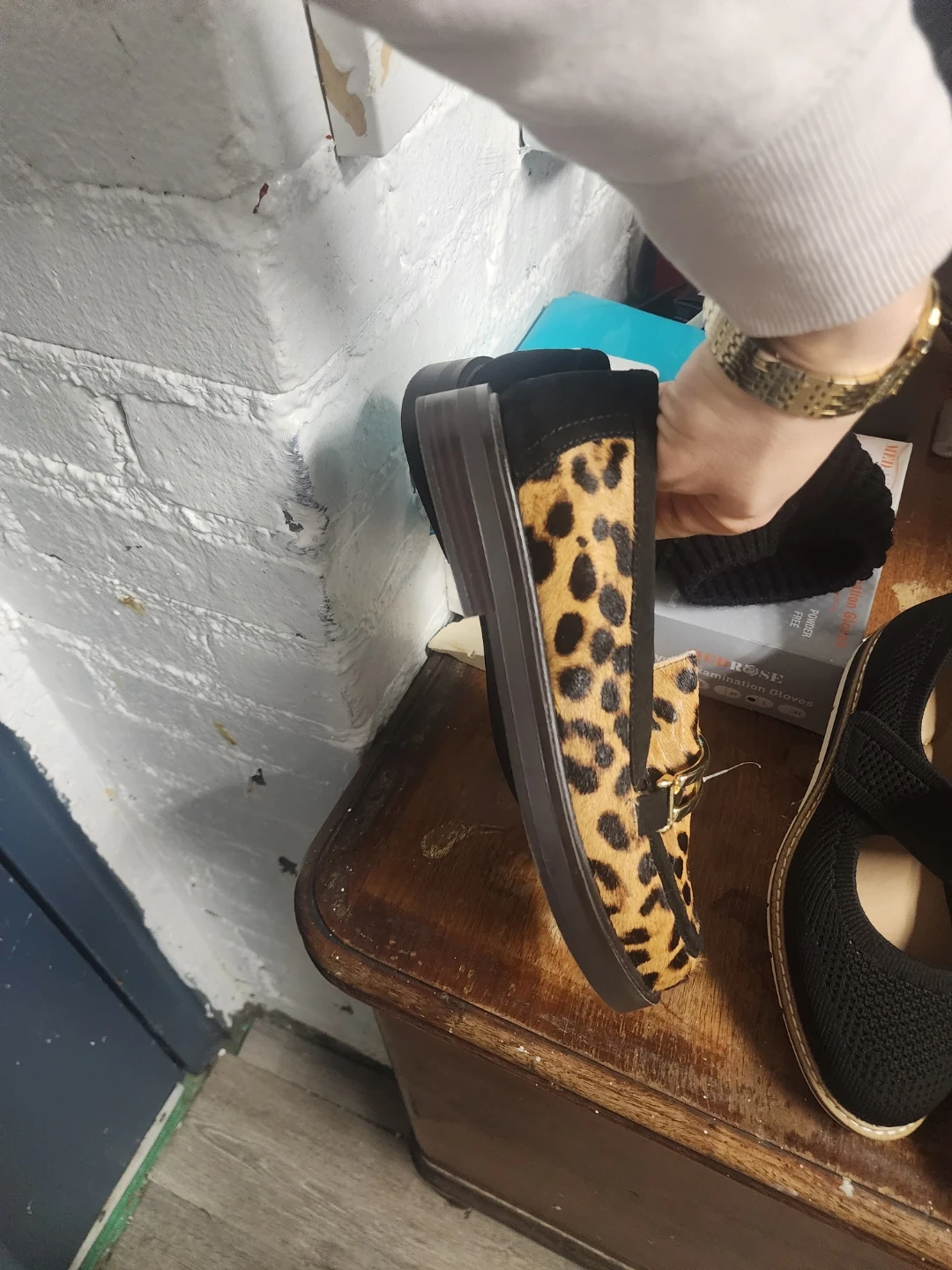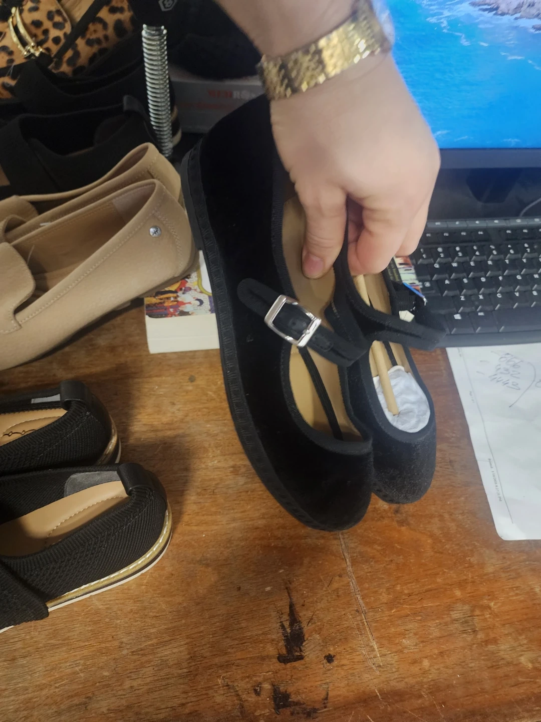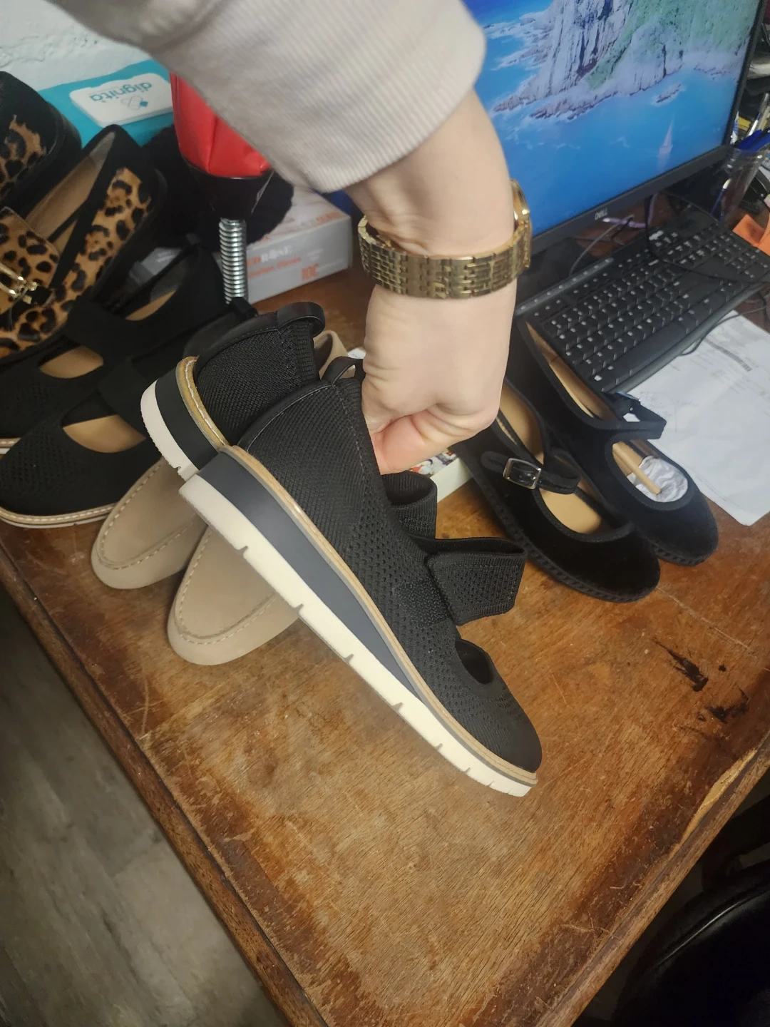 Bundle of women's flats including leopard print loafers by "me too" and black knit mary janes. Also includes beige loafers with "Hush Puppies" branding on the sole. Various sizes and materials.all those shoes for $60