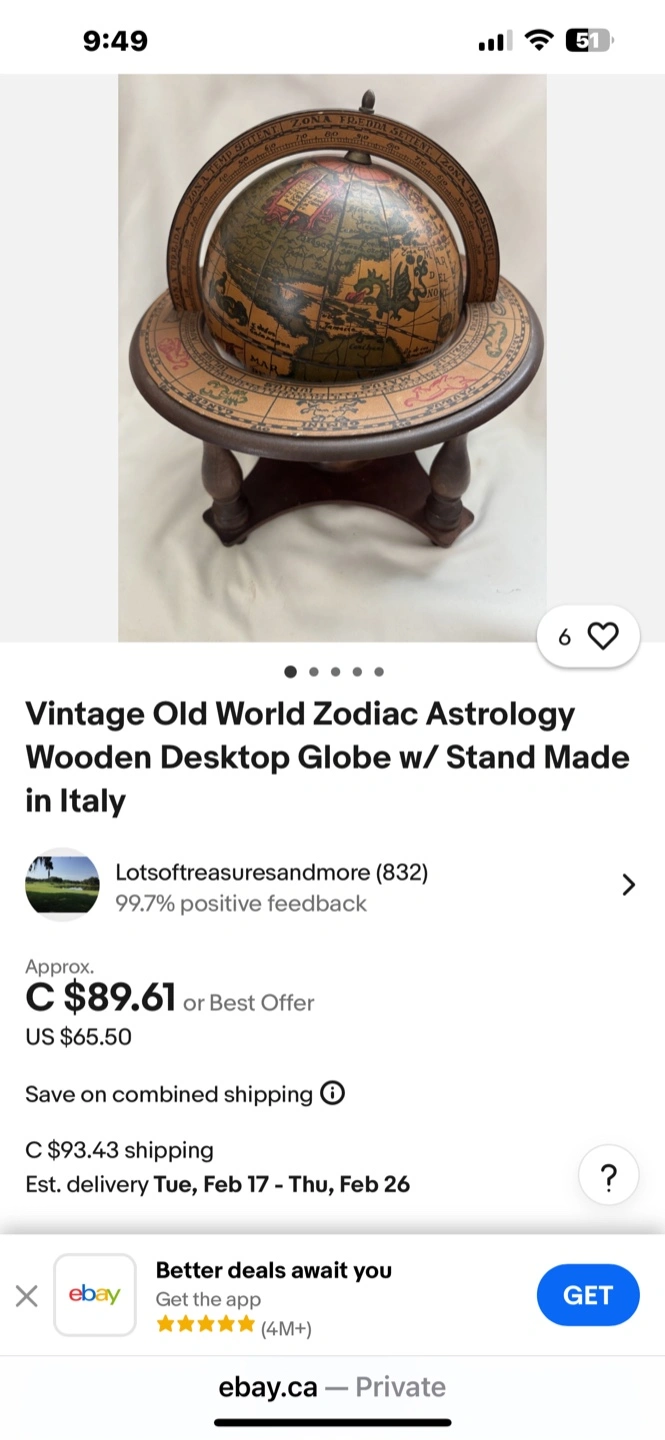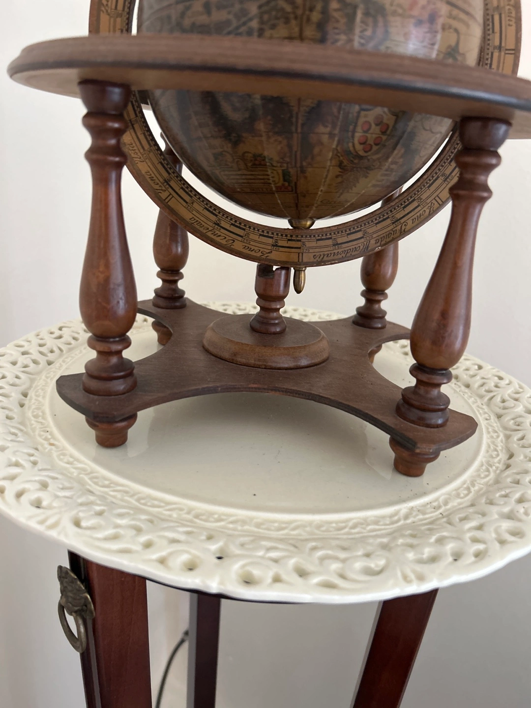 This made in Italy vintage desktop globe features a zodiac and astrology design with an old world map. It's made of wood with a wooden stand. The globe has intricate details and sits on a decorative base. It's a lovely decorative piece!