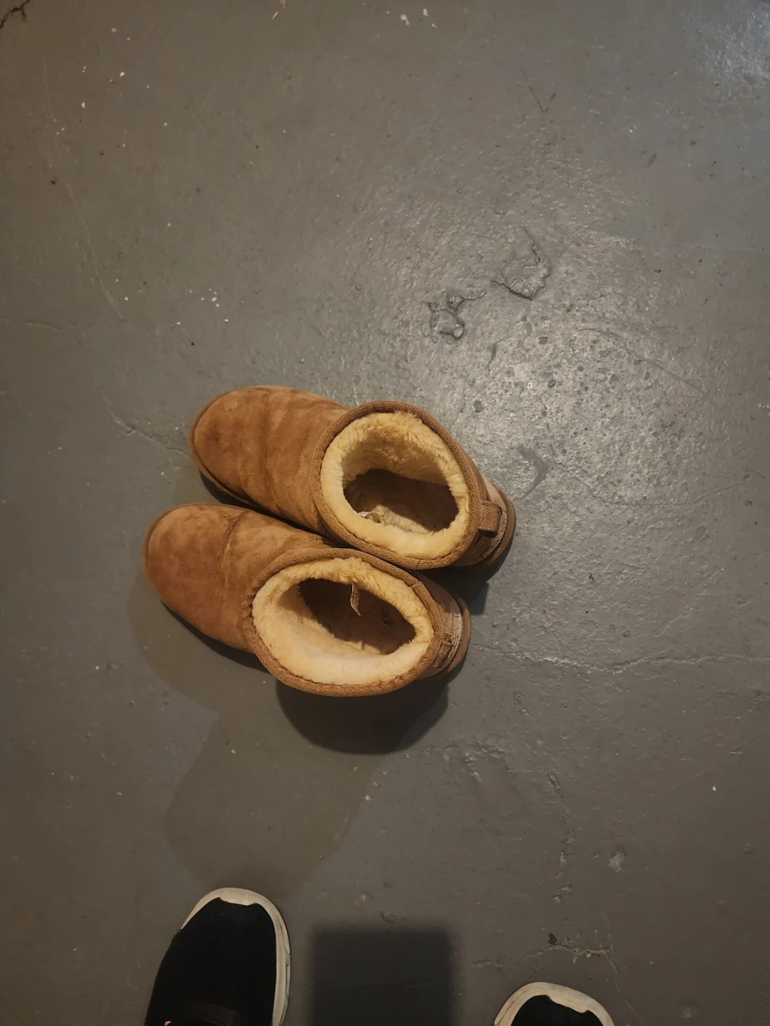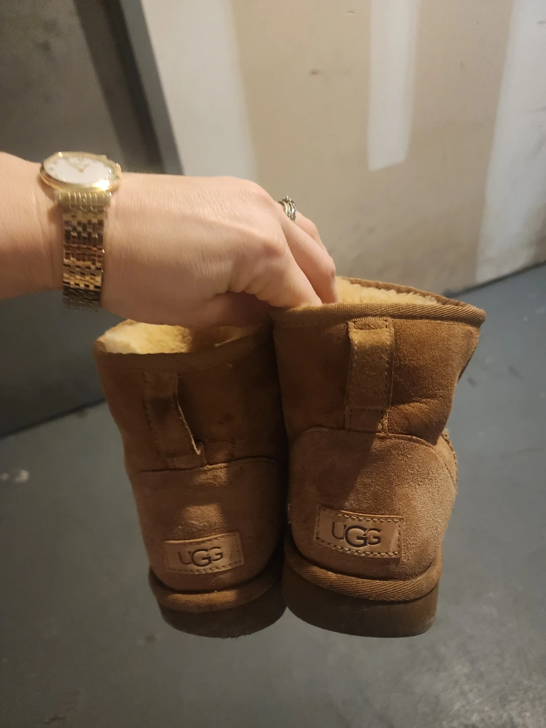 Brown UGG Australia boots crafted from suede with sheepskin lining. These short boots offer warmth and comfort.