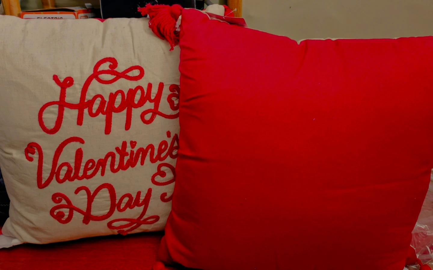 These festive pillows feature "Happy Valentine's Day" embroidered in bold red script. They're made from a textured linen-look fabric with red tassels on each corner. They'd be a sweet addition to your home decor for the season!