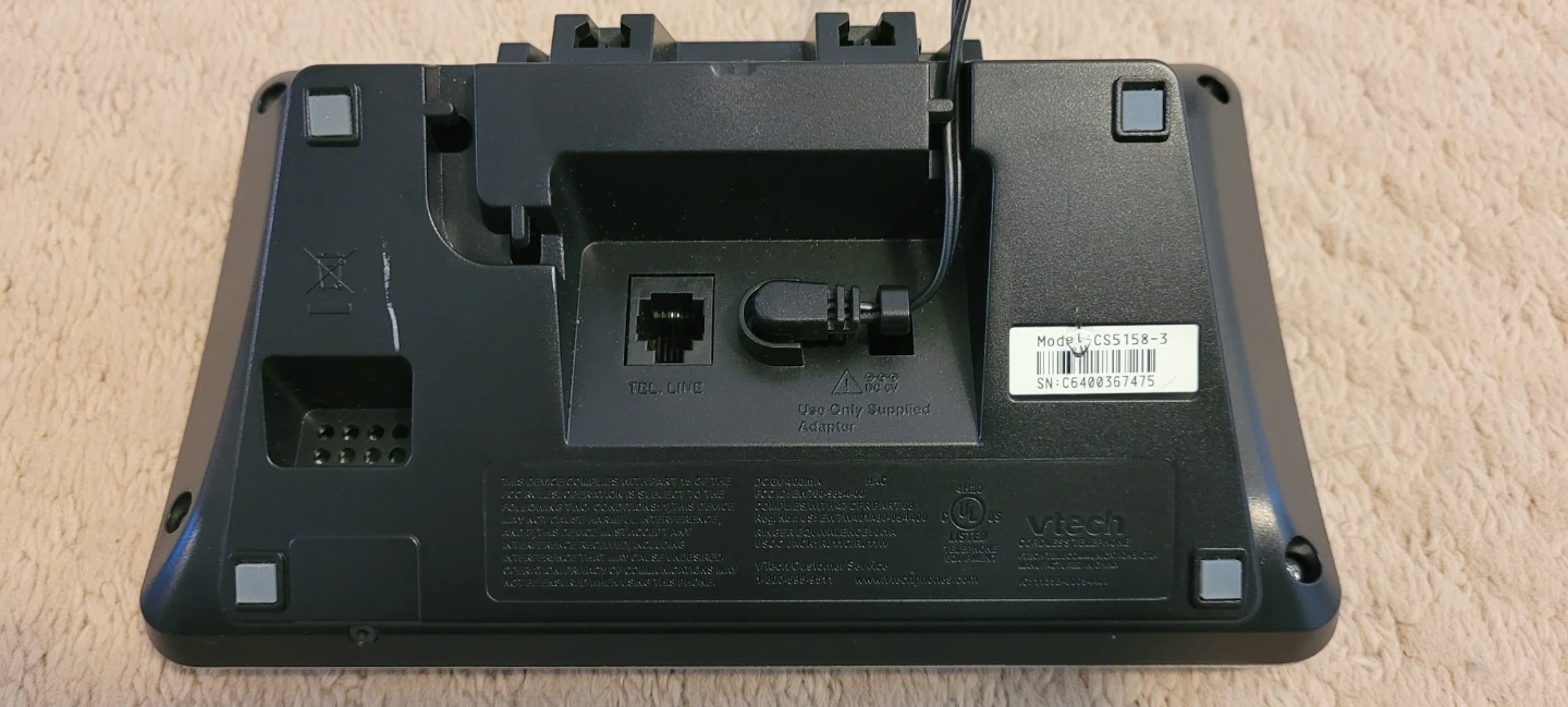 This VTech CS5158-3 phone system comes with a base unit and three cordless handsets. It's a digital answering system with a clear display and full keypad on each handset. The base unit is designed for easy use and connectivity.