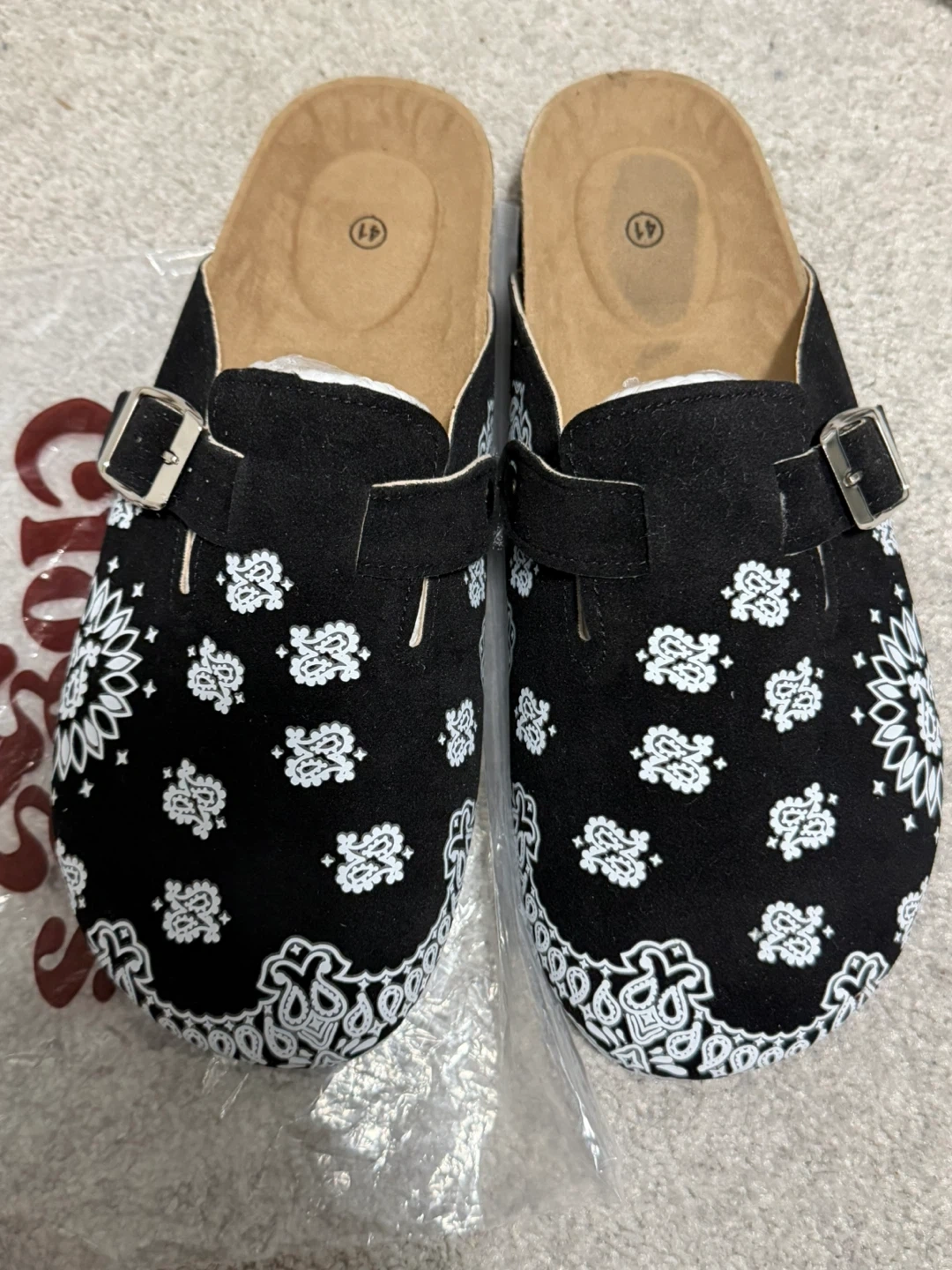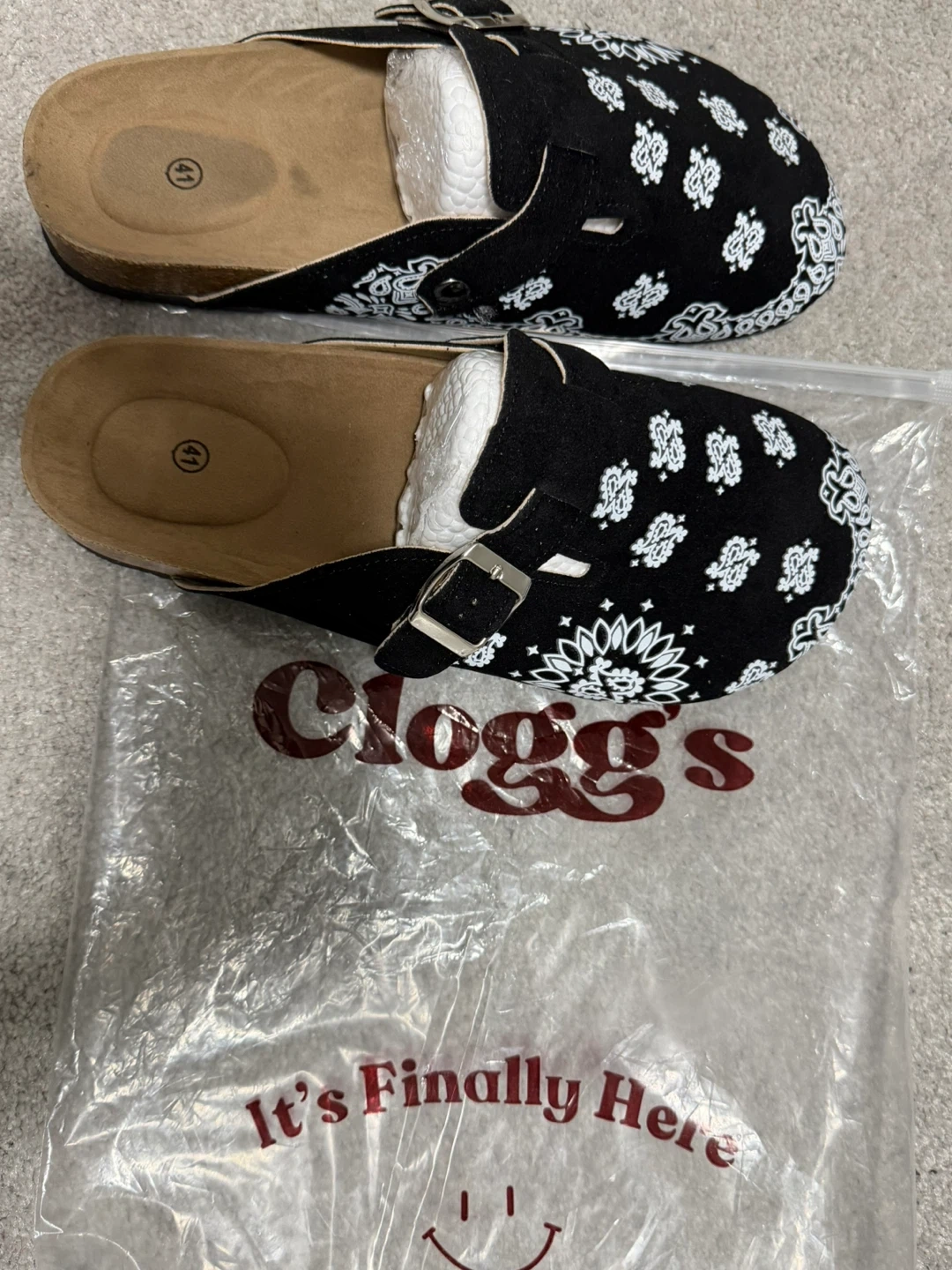 These Cloggs clogs feature a black bandana print. They're a size 41 with a cork footbed and adjustable strap. Great for casual wear!