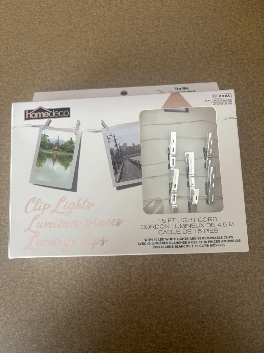 Homedeeco clip lights with 40 LED white lights and 16 removable clips. The light cord is 15 feet long. These lights are great for displaying photos!