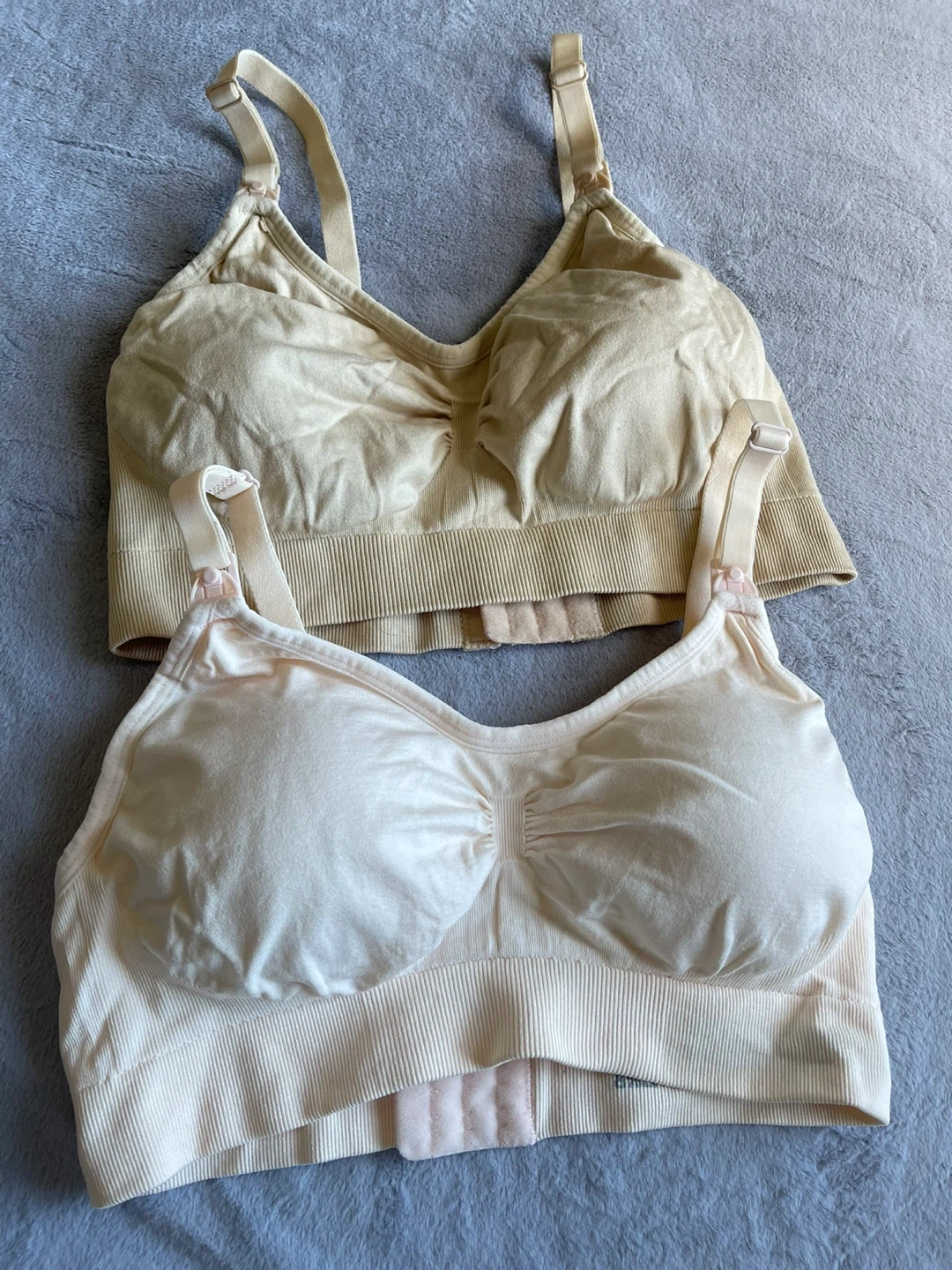 Two comfortable nursing bras included. One is beige, and the other is a creamy white colour. They're designed for ease of use and comfort. Made from a soft, stretchy fabric. The cream brand new And the beige used