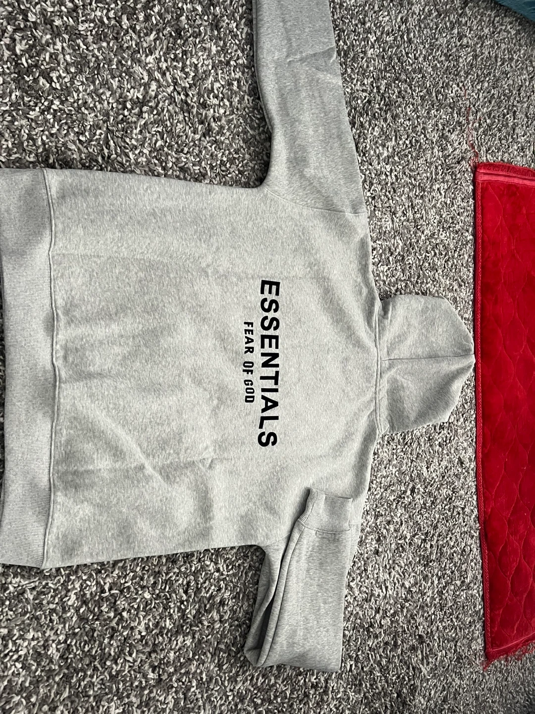 Grey ESSENTIALS hoodie with a front pouch pocket. Size small and made in Vietnam. It's a comfortable pullover style. Great for casual wear!