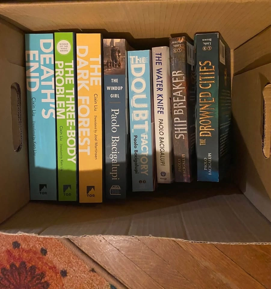 Pic 3: Liu - 3 books at $10 each; Bacigalupi - 5 books at $8 each.
