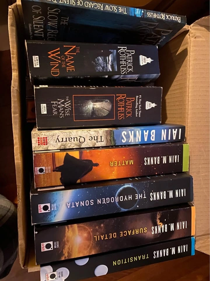 Pic 4: Rothfuss - 3 books at $5 each; Banks - 5 books at $8 each.