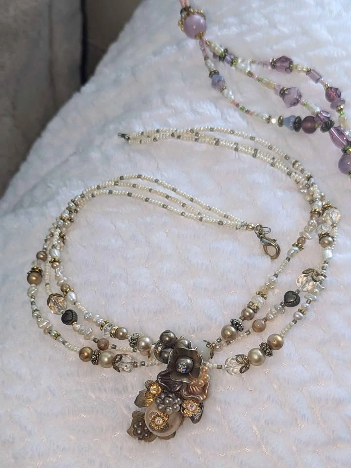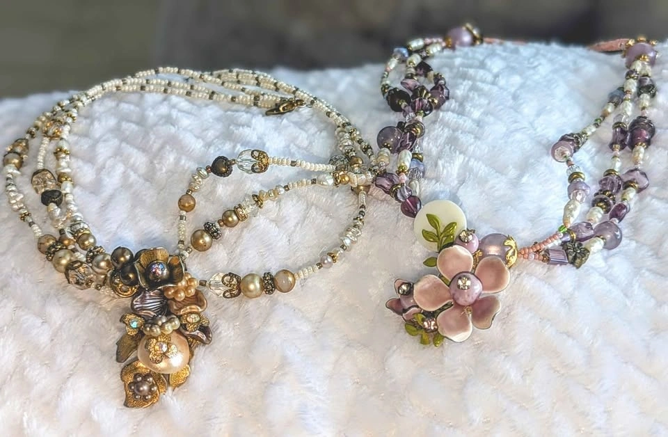 Beautiful handmade beaded necklaces with floral motifs and gorgeous jeweled resin charms. Please note one side of the clasp is missing on the white one; a simple O-ring is needed. Sold as a set only. Two for $40.