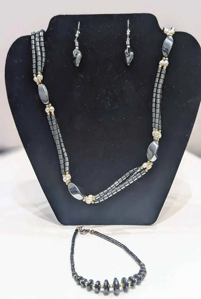 Beautiful 30" long necklace, drop earrings with heart shapes, and a free ankle bracelet in this set. All feature high-quality genuine Hematite stones. Makes a great gift.
