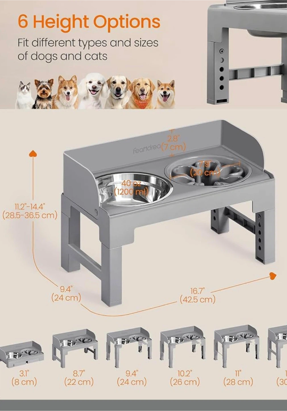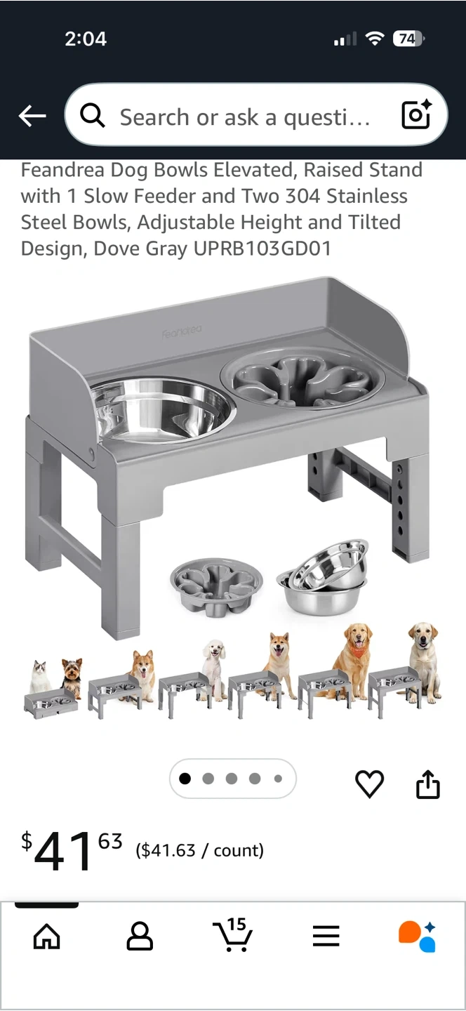 This Feandria elevated dog bowl stand comes with two 304 stainless steel bowls. It offers multiple height adjustments, fitting dogs and cats of various sizes. The tilted design helps reduce neck strain for pets.