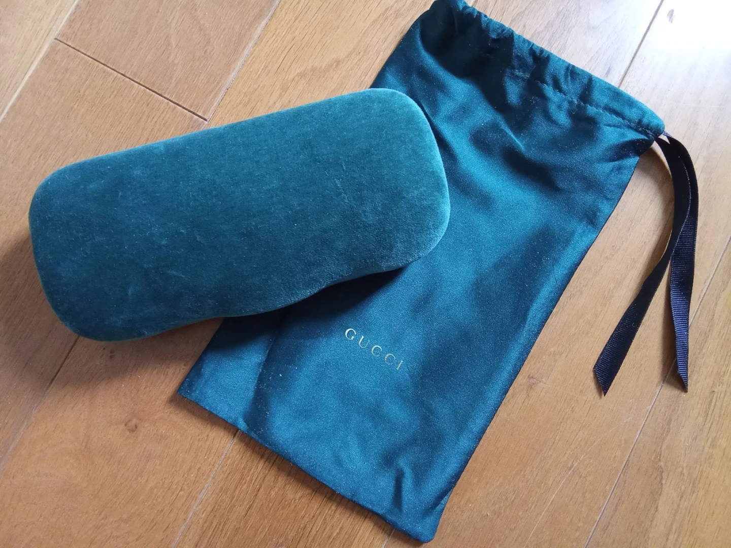 This is a teal velvet hard-shell sunglasses case and matching drawstring pouch from Gucci. The interior is lined with pink satin. It's perfect for protecting your eyewear!