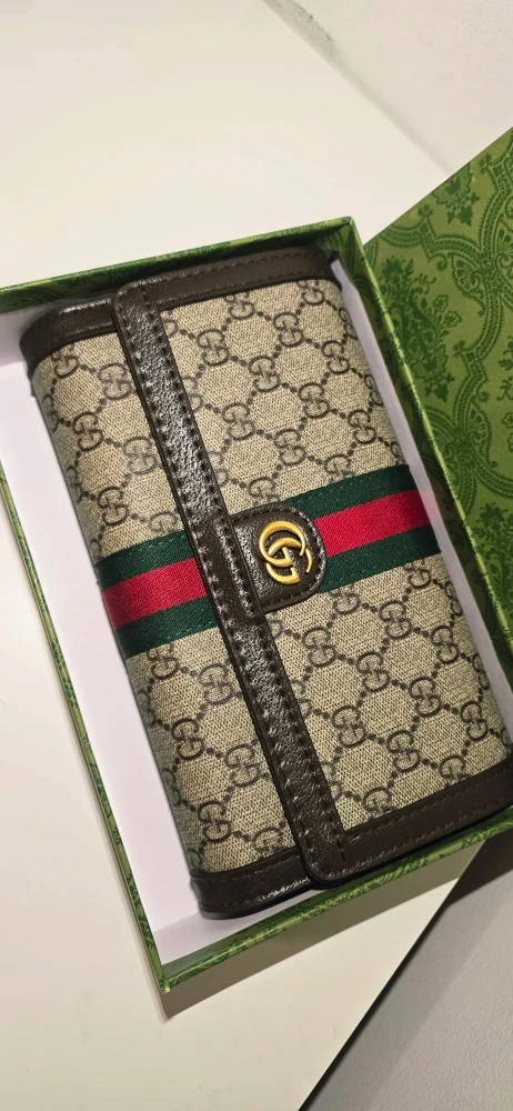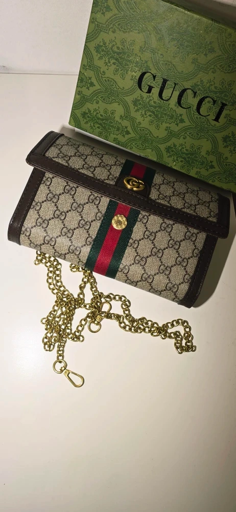 Authentic Gucci Ophidia GG wallet in beige and brown. It's made with the iconic GG Supreme canvas and features the signature green and red stripe. Includes a gold-tone chain strap for versatility. Comes in its original Gucci box!